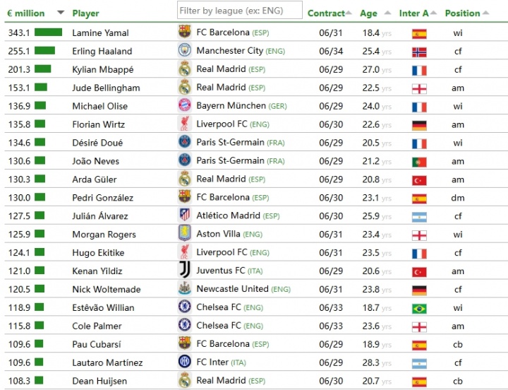 直播吧01月07日讯CIES足球天文台发布了最新报告,根据CIES的统计模型,更新了转会价值前100的球员。亚马尔以3.431亿欧位列第一,哈兰德和姆巴佩排名第二、第三。五大联赛之外转会价值最高的是罗克8500万欧。