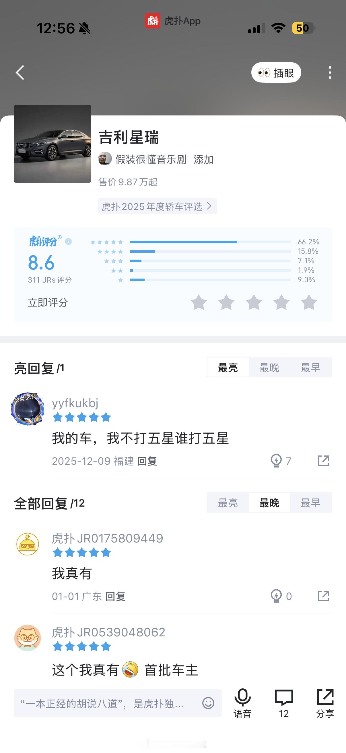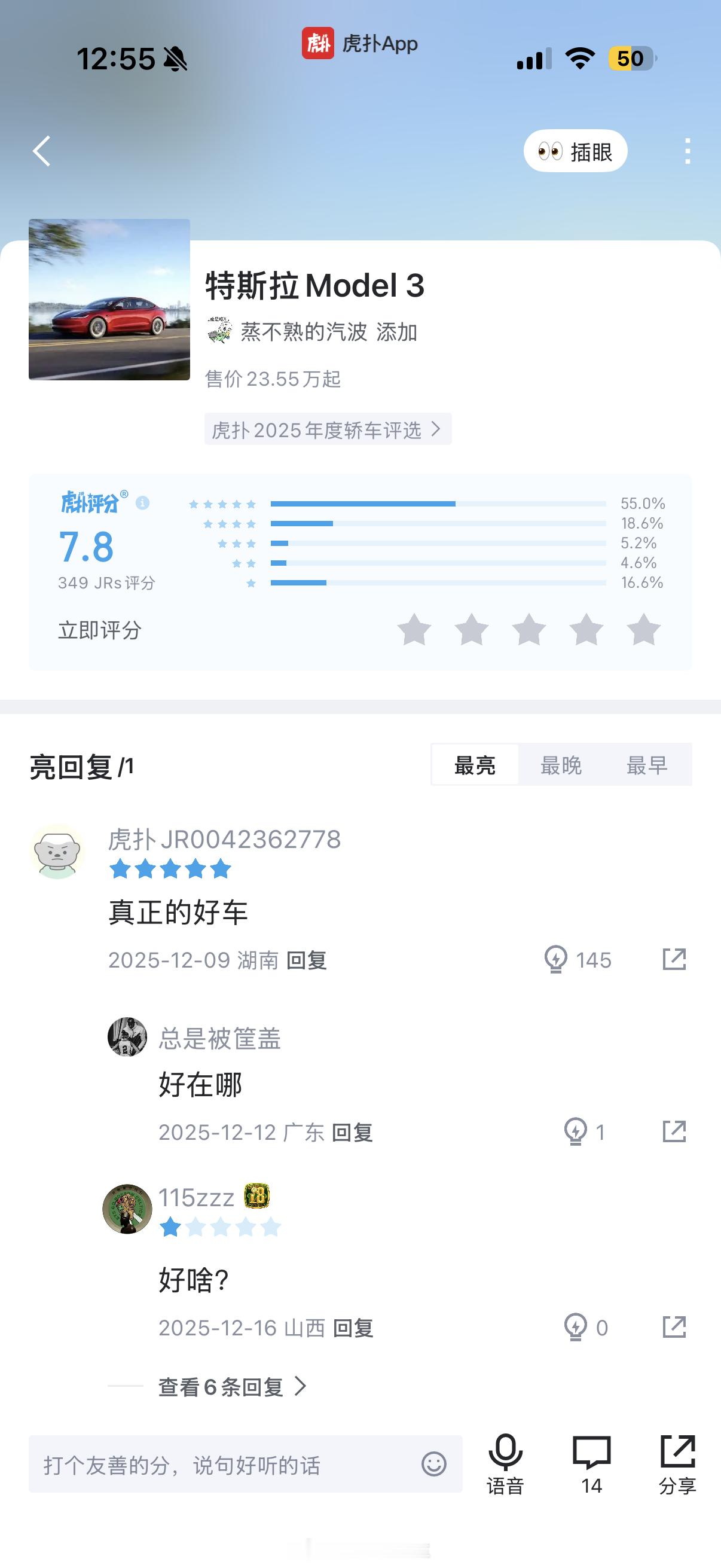虎扑2025年度轿车,排名动态更新。现在第1是奔驰S,第10是特斯拉Model3。看了几款网红车排名,小米SU7第11,尊界S800第19,竟然没看到问界的车。星瑞第二是没想到的,底下都是车主在应援虎扑