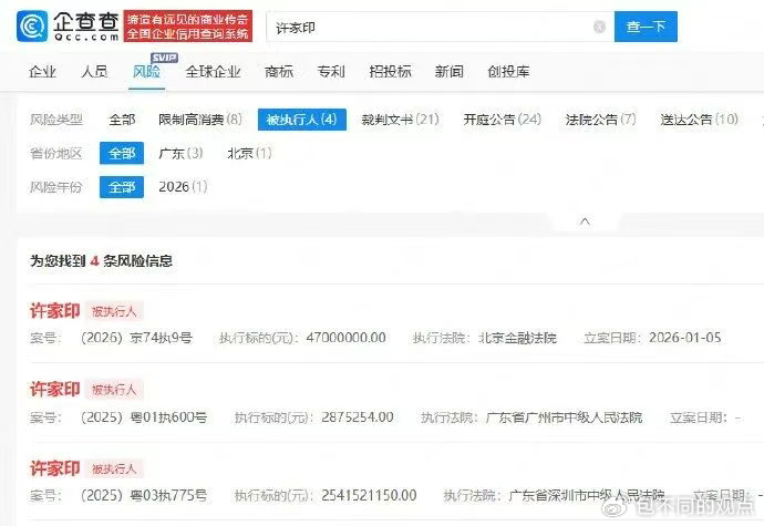 企查查信息显示,许家印新增一则被执行人信息,执行标的4700万元人民币,执行法院为北京金融法院,立案时间为2026年1月5日。