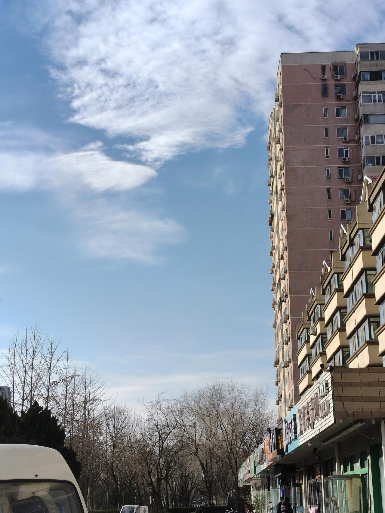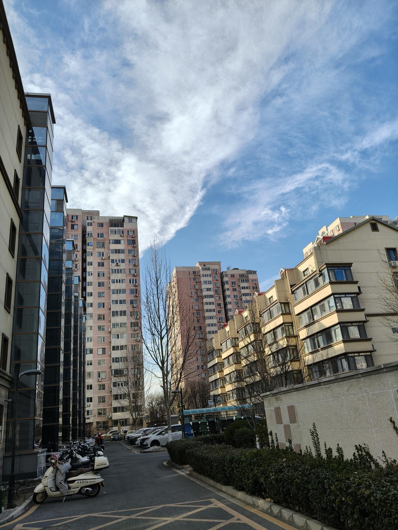 蓝蓝的天上挂白云!薄薄的白计铺满天空,和蓝天相互映衬妙趣横生! 天特别蓝,云特别白!引得许多路人驻足观看,仰望拍照打卡!