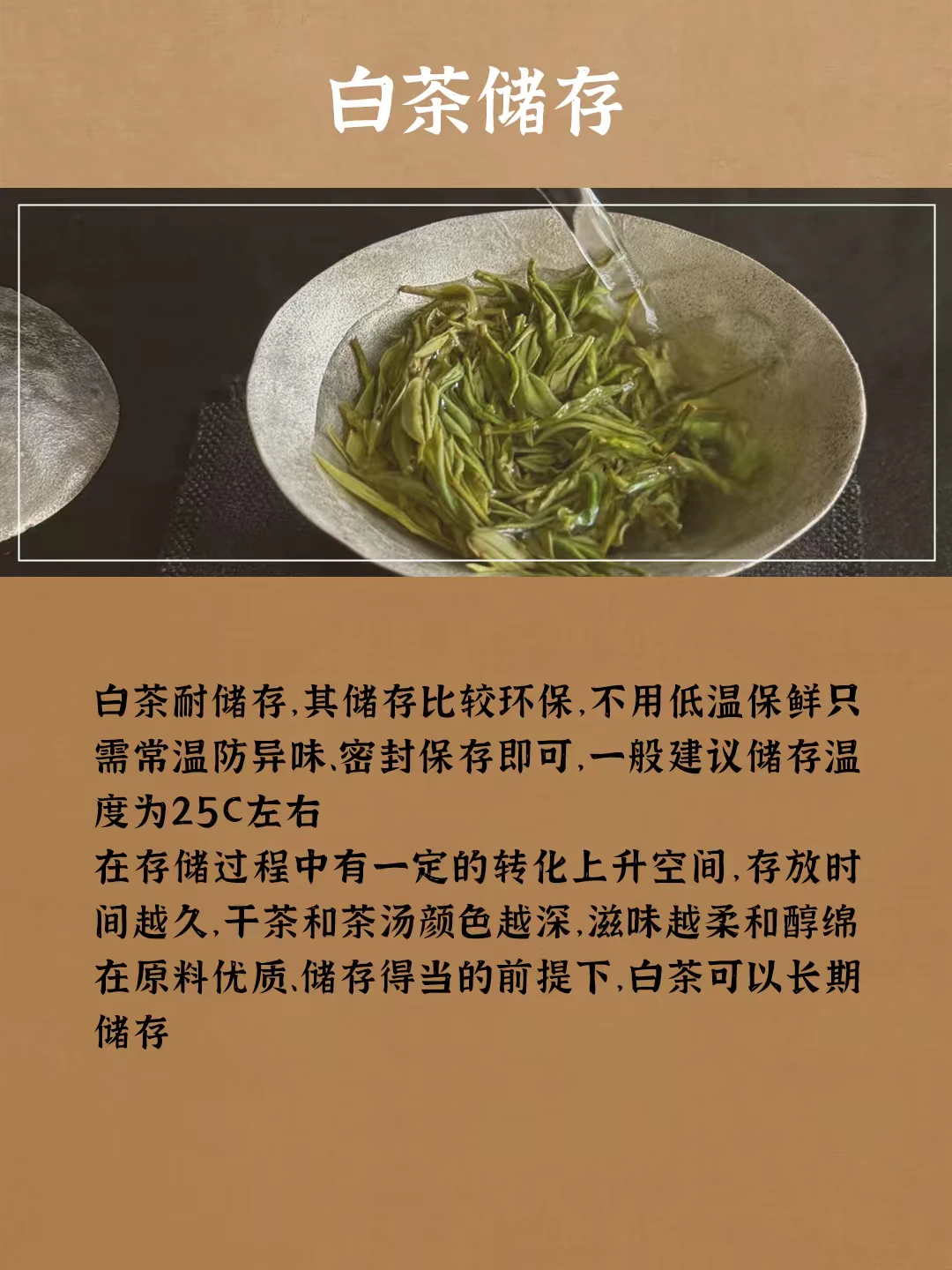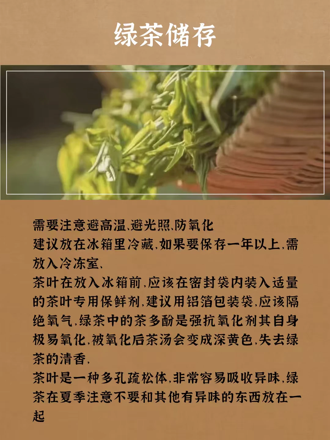 红茶储存 需尽量避免不同种茶叶的混合存放,一般可放置在密闭干燥容器内,避优质的红茶储存用密封铁罐或锡罐为佳 白茶储存 白茶耐储存,其储存比较环保,不用低温保鲜只需常温防异味、密封保存即可,一般建议储存温度为25C左右 黑茶储存 黑茶保存需要通风、干燥、无异味 乌龙茶储存 乌龙茶属于半发酵茶,介于红茶绿茶之间比较容易贮藏,常温保存即可,放冰箱低温保存为好 绿茶储存 需要注意避高温、避光照、防氧化