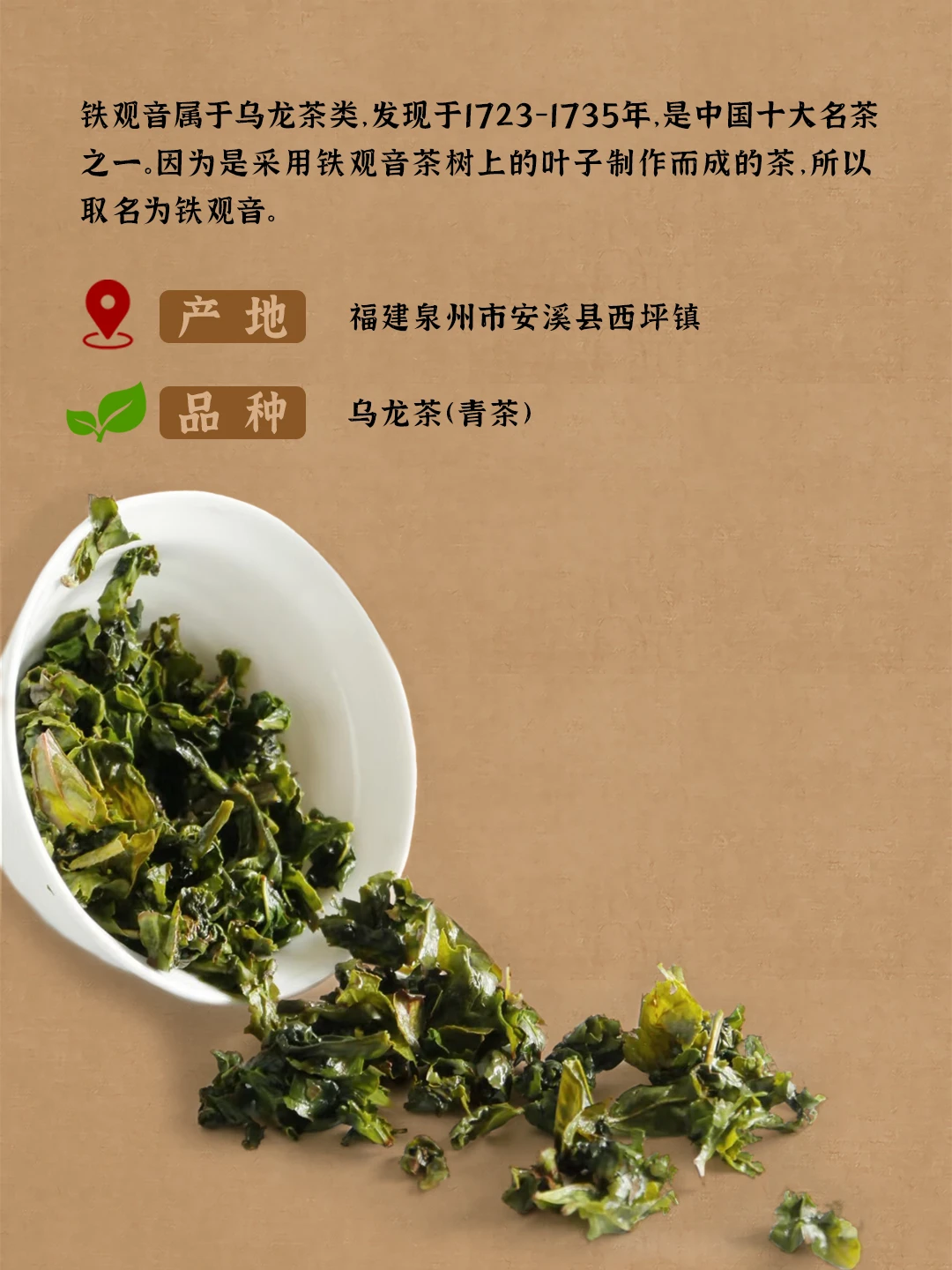 铁观音是中国十大名茶之一,属半发酵乌龙茶,原产于福建安溪。其名传说源于乾隆皇帝赐名,因茶叶沉如铁、形似观音而得名。
