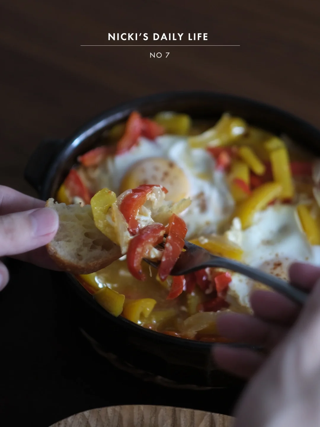 买到了很好吃的黄油蒜泥法棍,也是时隔1个多礼拜,我终于尝出了一些味道来。做了甜椒蛋和南瓜浓汤,他们两和法棍很搭。甜椒切丝和洋葱丝一起下锅煸炒,炒软后加盐、甜椒粉、胡椒、水,焖煮15分钟,打入两个可生食鸡蛋,盖上锅盖小火煮5分钟左右即可。