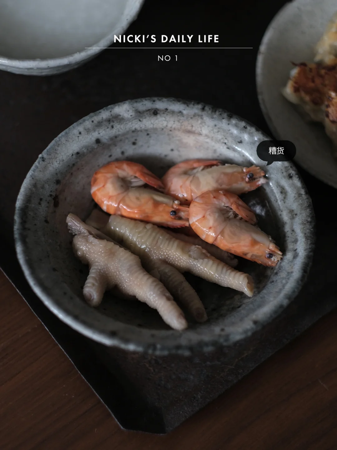 夏天的餐桌必不可少的应该就是糟货,喜欢啃骨头的我糟了一些鸡爪,妈妈糟了大头虾,一人分一半,就着白粥,煎上几个馄饨,早餐这么吃很舒服。