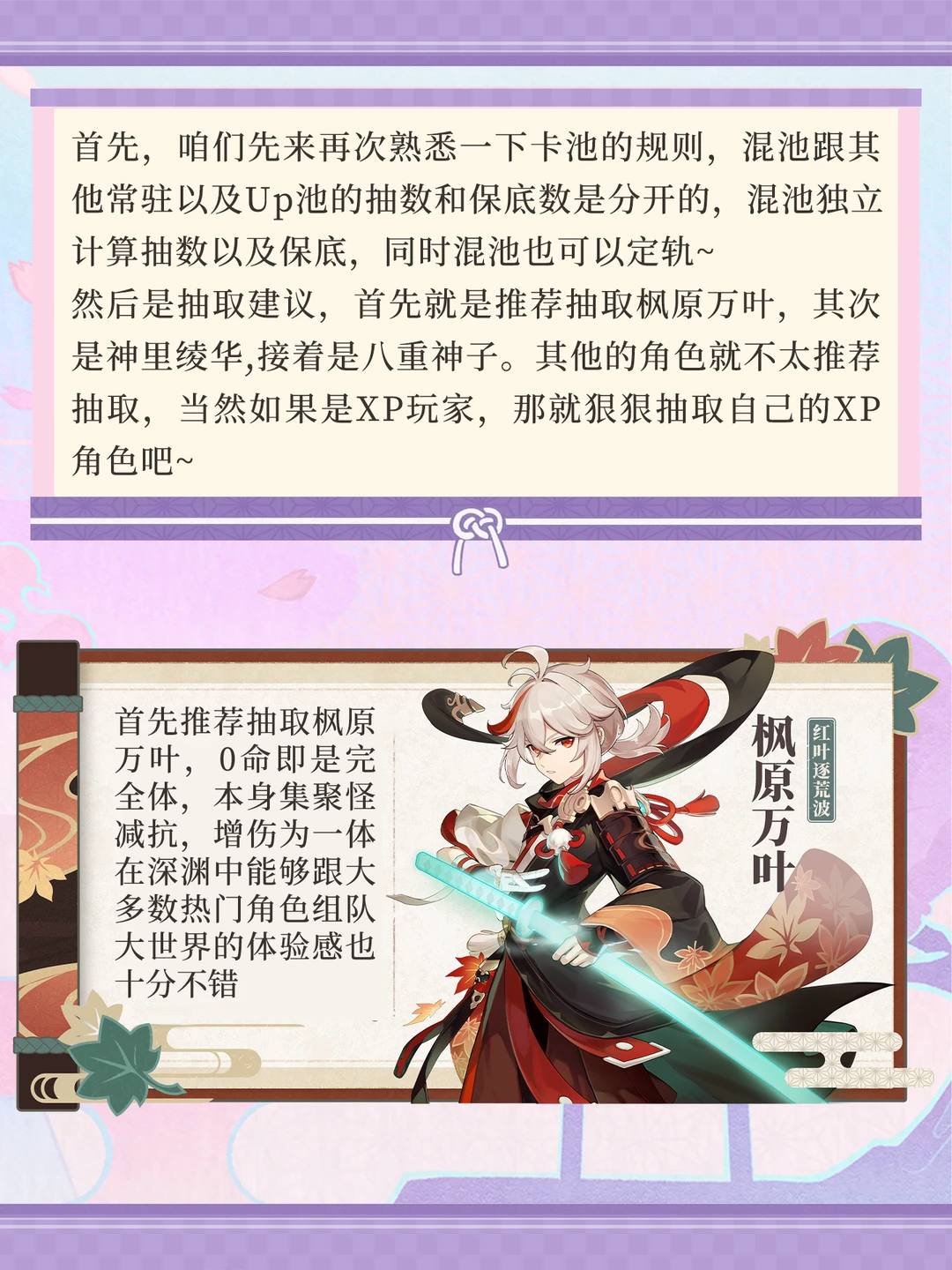 稻妻混池开啦,祝大家十连双黄! 抽取建议方面,优先XP! 从强度上推荐抽取枫原万叶、神里绫华、八重神子[哇R]
