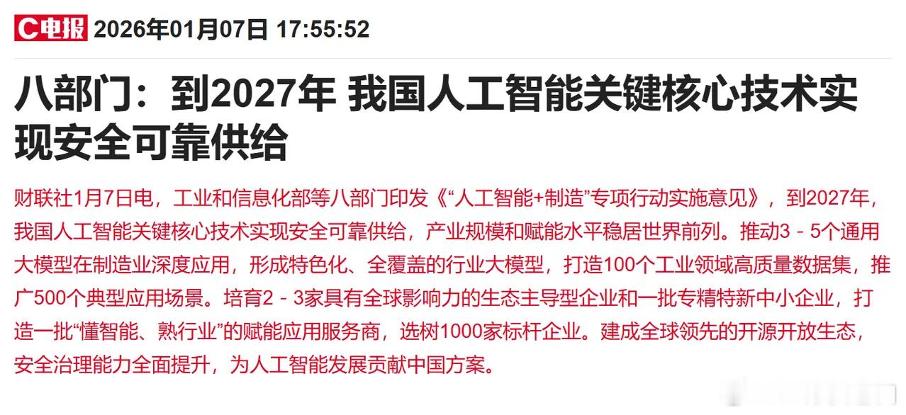 盘后两大重磅消息落地!周四市场节奏或迎关键变化盘后两条重要消息来袭,直接影响明日行情走向!首先要明确的是,周四将有11000亿元买断式逆回购到期,而央行同步开展等量的11000亿元买断式逆回购操作,本质上属于等量对冲,大家完全不必过度兴奋。本周资金面压力其实不容小觑,除了11000亿元买断式逆回购到期,还有13236亿元普通逆回购到期。不过好消息是,周一到周三的13236亿元逆回购到期压力已顺利消化,且周四、周五暂无逆回购到期压力。但需要警惕的是,大盘在收获14连阳后,今日盘面已呈现跌多涨少的分化格局,这意味着短期资金多空分歧正在加剧,部分短线资金已经开始萌生畏高情绪。更值得关注的是,尾盘集合竞价阶段中信证券再现14.5亿元大单压盘,这大概率是控盘资金意图放缓指数上行节奏的信号,本周后半周仍需提防短期抛压的出现。另一条关键消息是,工信部等八部门联合印发《“人工智能+制造”专项行动实施意见》,明确提出到2027年实现人工智能关键核心技术安全可靠供给。这一政策对于AI应用板块构成直接利好,明日需重点关注该板块的情绪动向。事实上,节前最后一个交易日AI应用板块曾迎来普涨行情,只不过节后资金主攻方向转向了国产替代硬科技、周期有色、煤炭以及保险金融等领域。从产业逻辑来看,今年堪称AI应用元年,行业正处于从基础硬件向应用落地的关键转型期,这一主线至少在春节前,都将是资金重点布局的方向。整体而言,大盘在连续长阳后涨幅已显放缓迹象,但两市成交额维持活跃状态,市场后续仍会以主线题材轮动为主旋律。周四市场或将迎来不小的压力考验,但指数节奏被压制并不代表没有做多机会,核心在于把握好参与节奏。接下来,不妨将目光聚焦在脑机接口与AI应用两大方向,跟踪资金的动向选择。指数中长期向上趋势并未改变,短期适度回踩反而有助于行情节奏的修复,操作上建议紧扣逻辑强劲的题材概念展开布局。从春季行情的演绎规律来看,一波行情绝非单一板块的独舞,而是一批板块的轮动上涨,不同板块之间只是存在节奏快慢的差异而已。