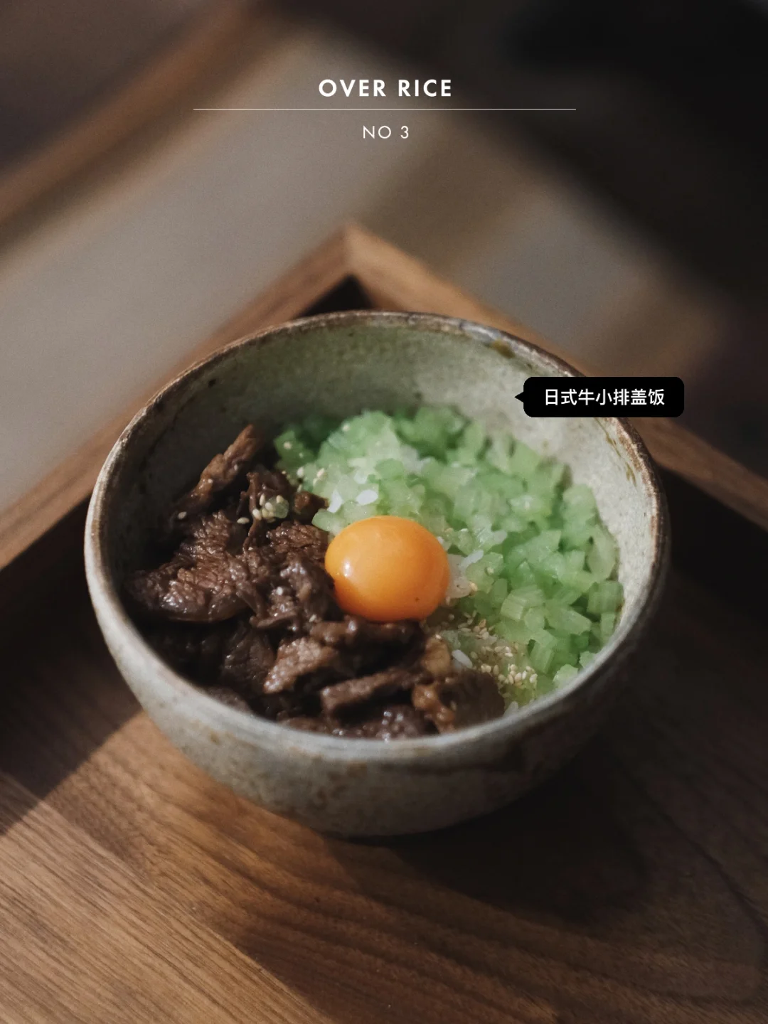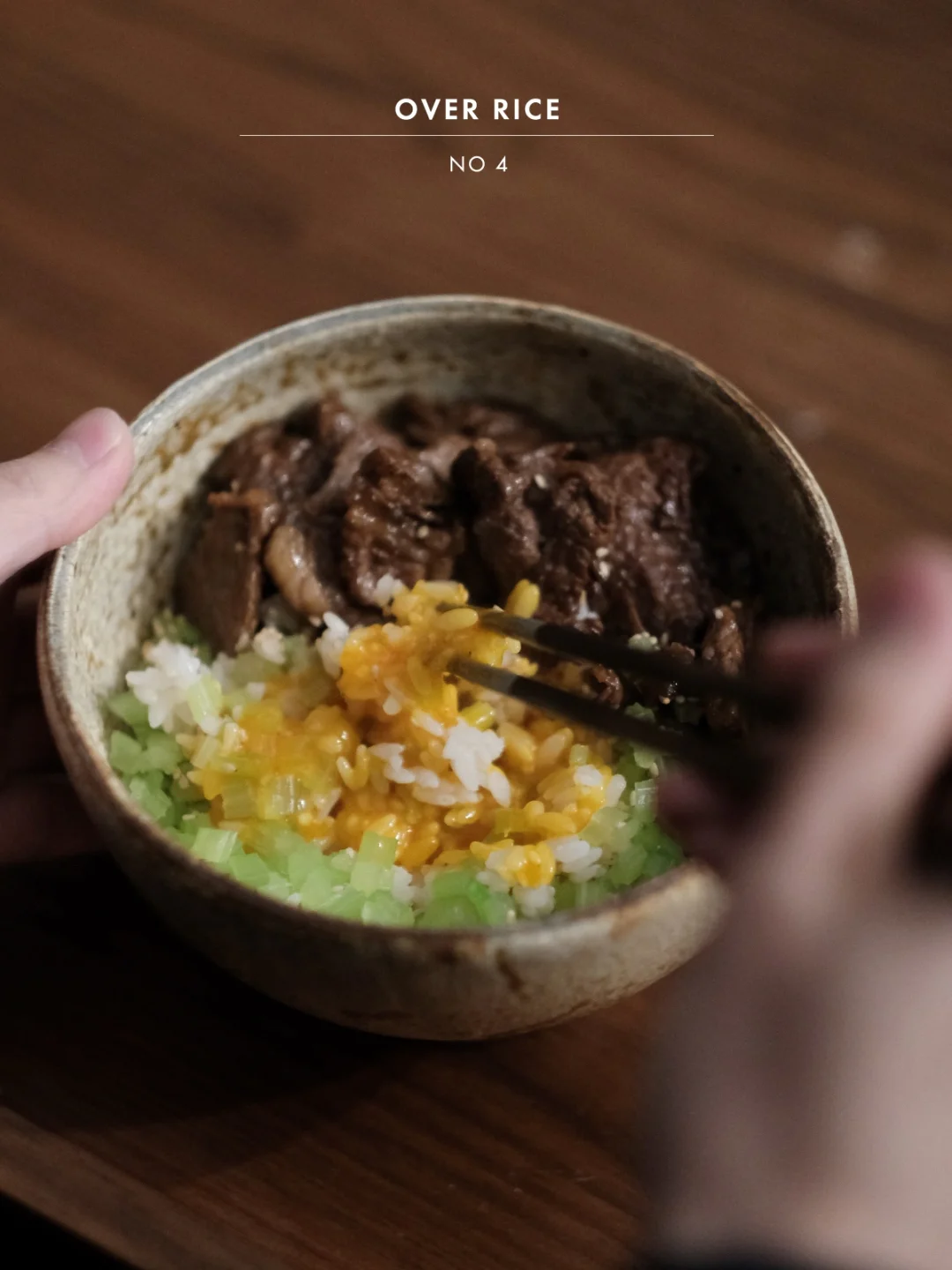 • 芹菜切小丁,热水汆烫一小会立马盛出,保留芹菜脆的口感,盛一碗米饭,依次放上洋葱丝、牛肉、芹菜,最后放一个可生食鸡蛋黄。