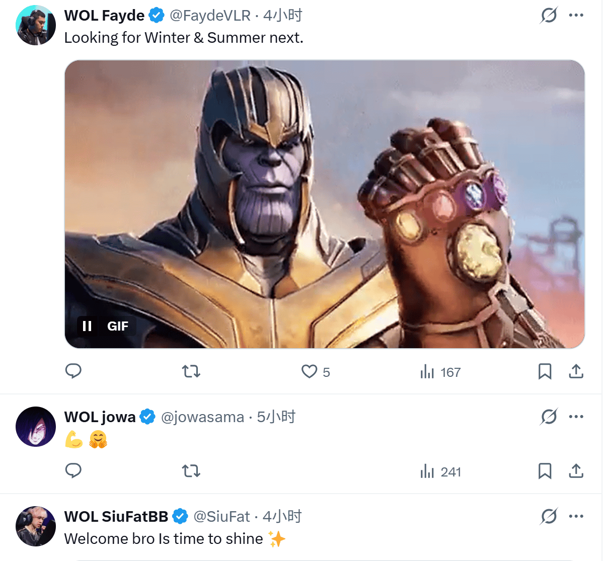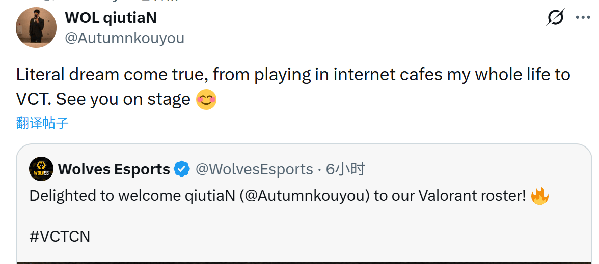 虎扑01月08日讯WOL官宣qiutiaN加入,qiutiaN转发官宣消息: