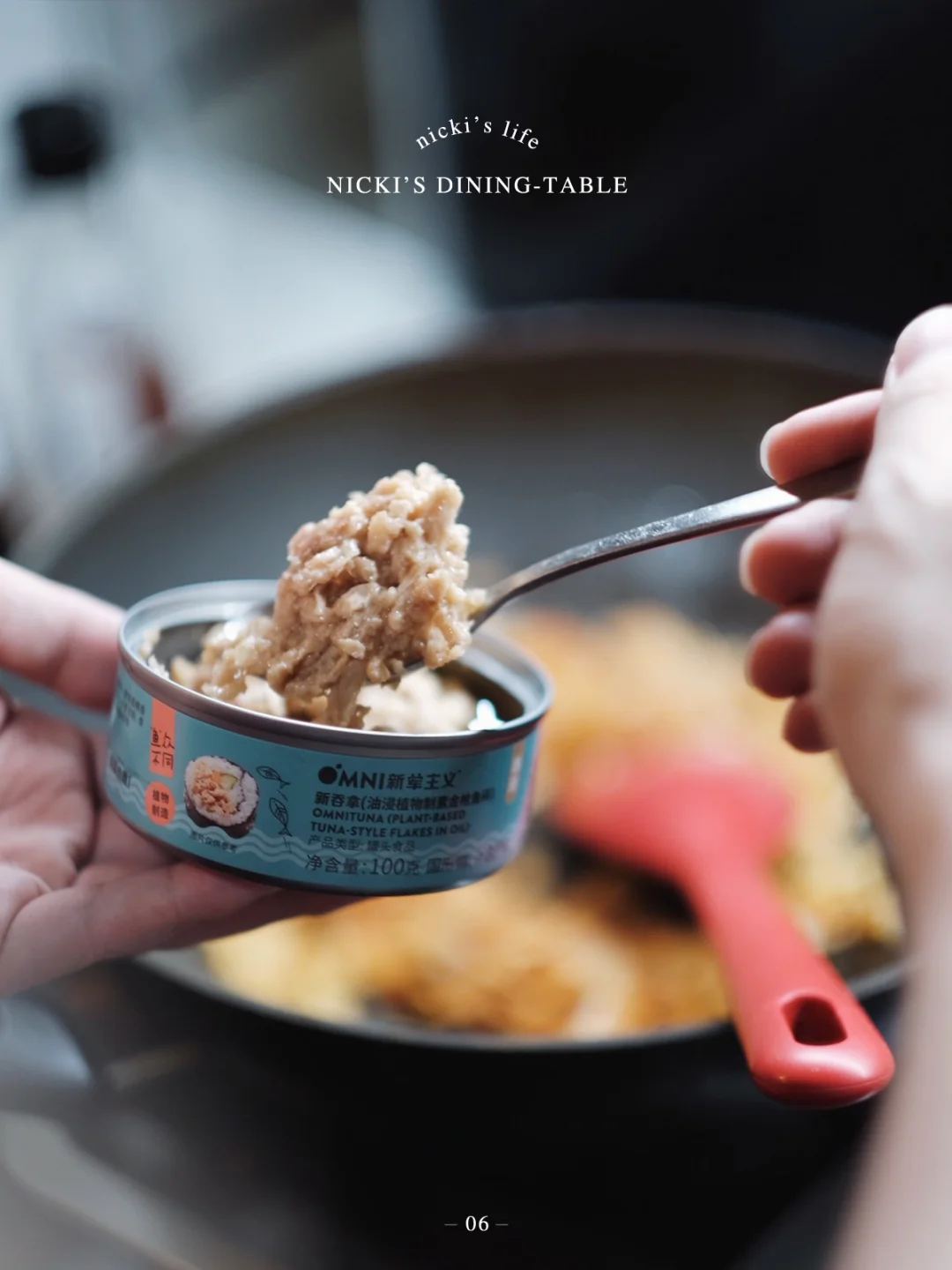 •锅中倒油,倒入洋葱煸炒出香味后,放入泡菜一起翻炒,倒入一罐OMNI新吞拿、一碗隔夜饭,加2勺生抽。