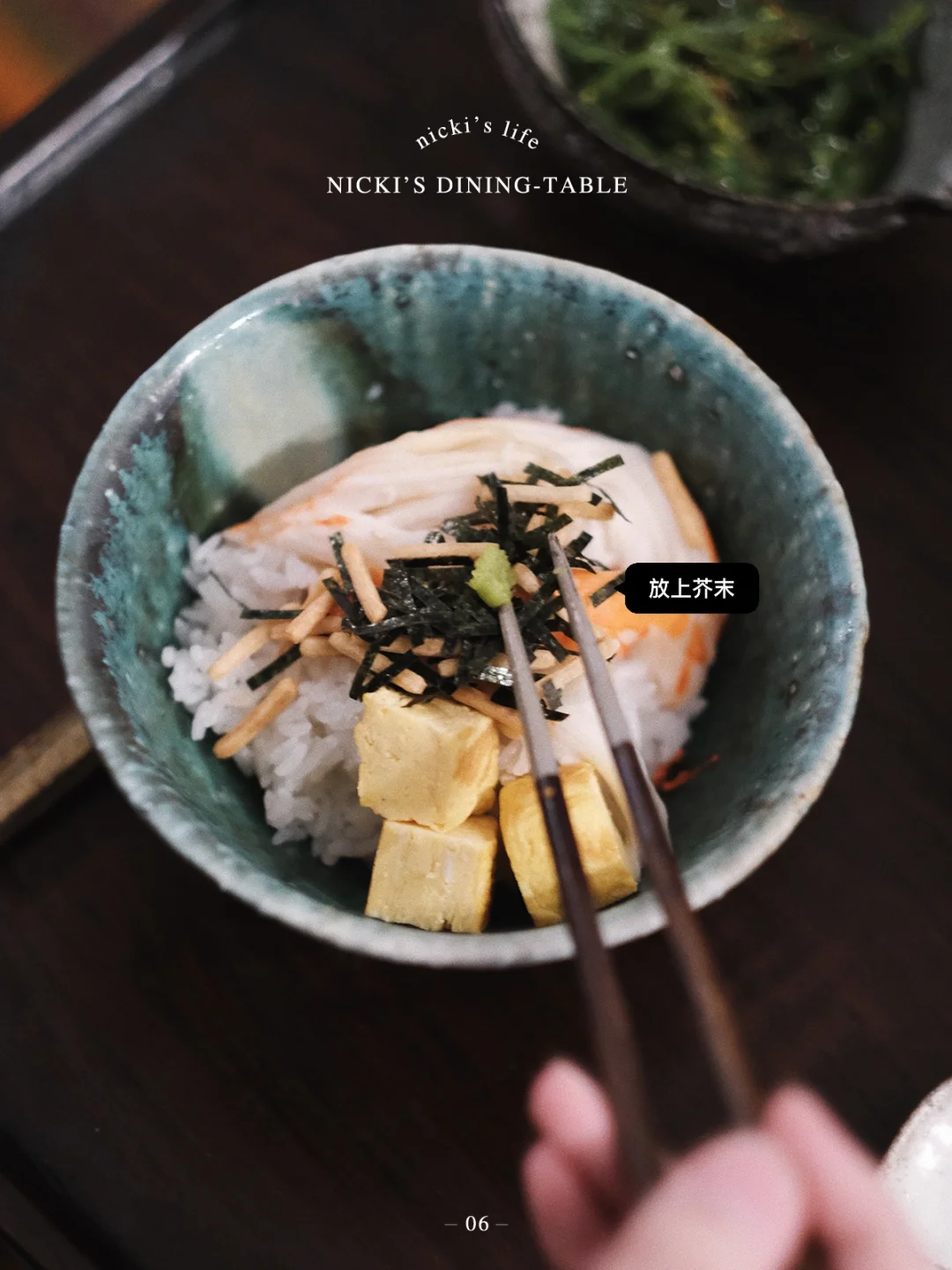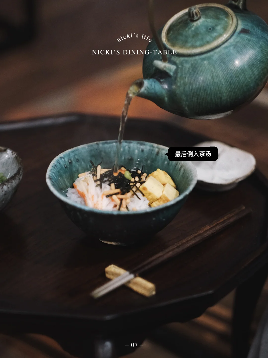 在日本,其实茶泡饭并非一开始就将茶汤倒入饭中。吃法上有三个步骤,先是品尝米饭上盖物,第二步,淋上酱汁,将米饭和盖物一起吃,最后吃剩一半左右的时候再倒入海苔、芥末和茶汤。