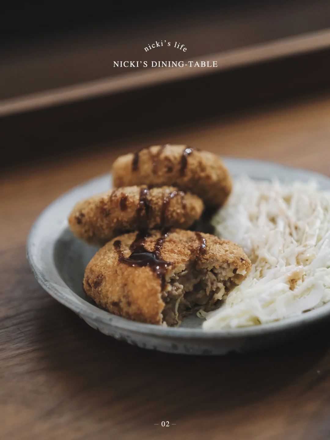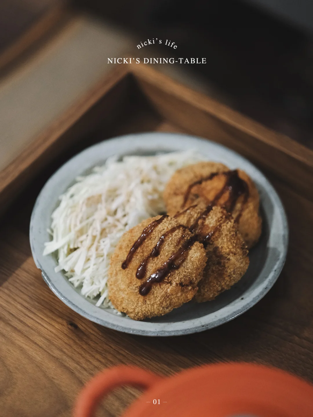 • 炸好的可乐饼装盘,放上卷心菜丝解解腻,最后淋上芝麻酱即可。