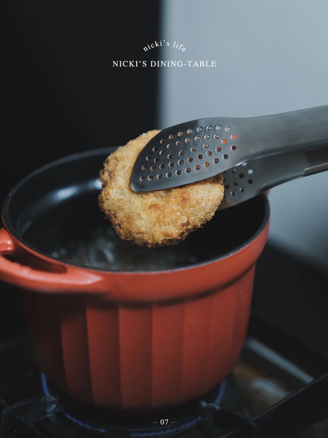 • 开始油炸三部曲:淀粉👉蛋液👉面包糠,下锅油炸。