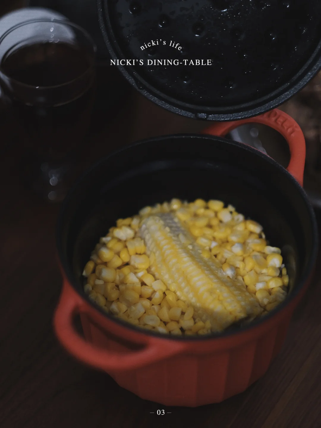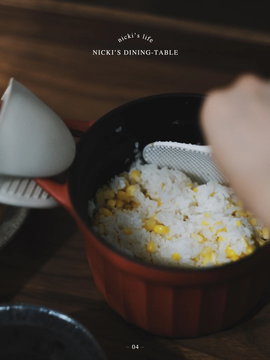 • 米洗净放进焖煮锅中,水的量和平时煮饭一样,将玉米芯放在米饭上,周围铺上玉米粒(玉米芯一起煮,能更好的尝到玉米的香甜)。