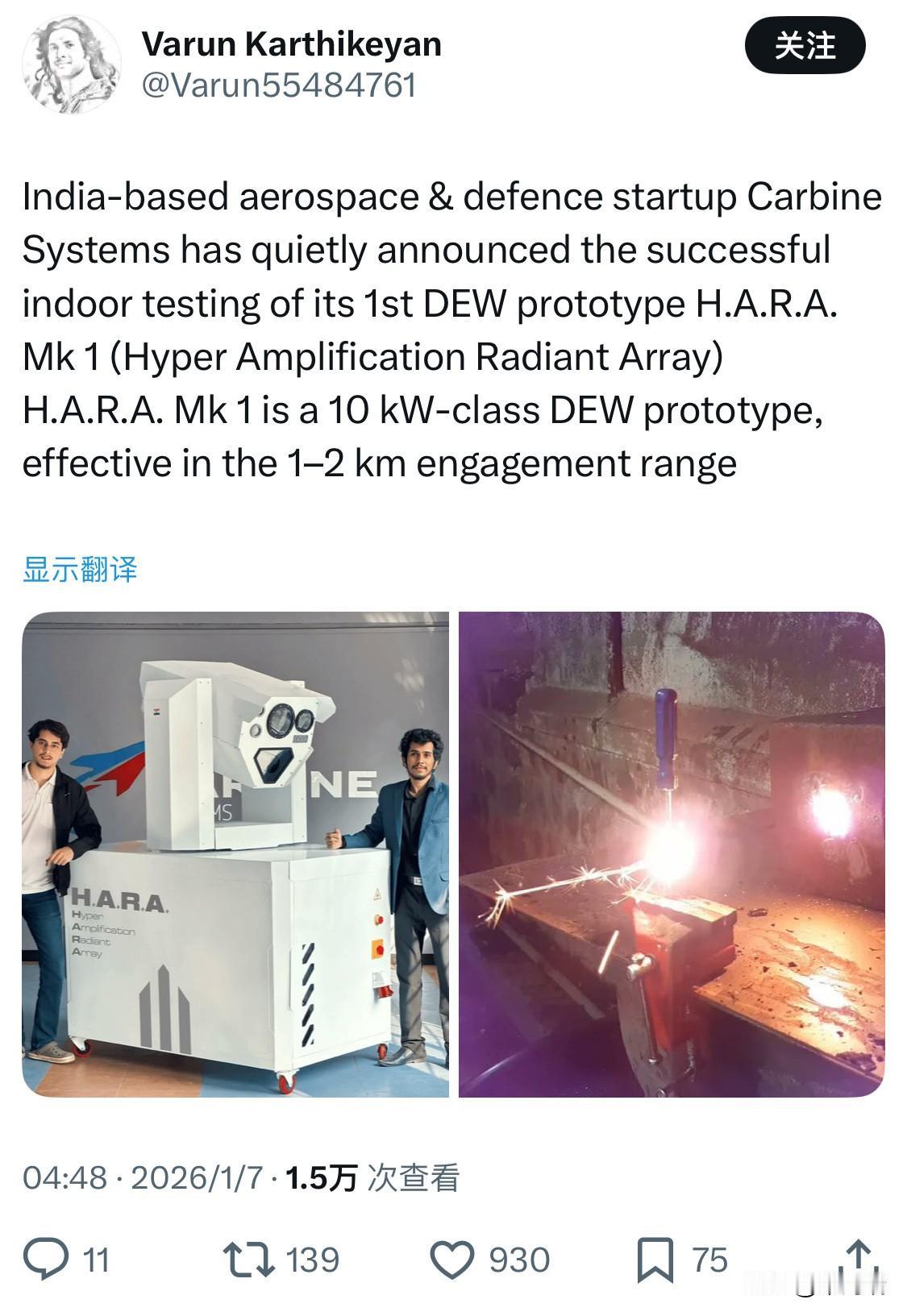 印度的航空航天和国防初创公司 Carbine Systems 宣布,其首款定向能武器原型 HARA Mk 1(超放大辐射阵列)已成功完成室内测试。 HARA Mk 1 是一款功率为 10 千瓦级的定向能武器原型,有效交战距离为 1-2 公里。