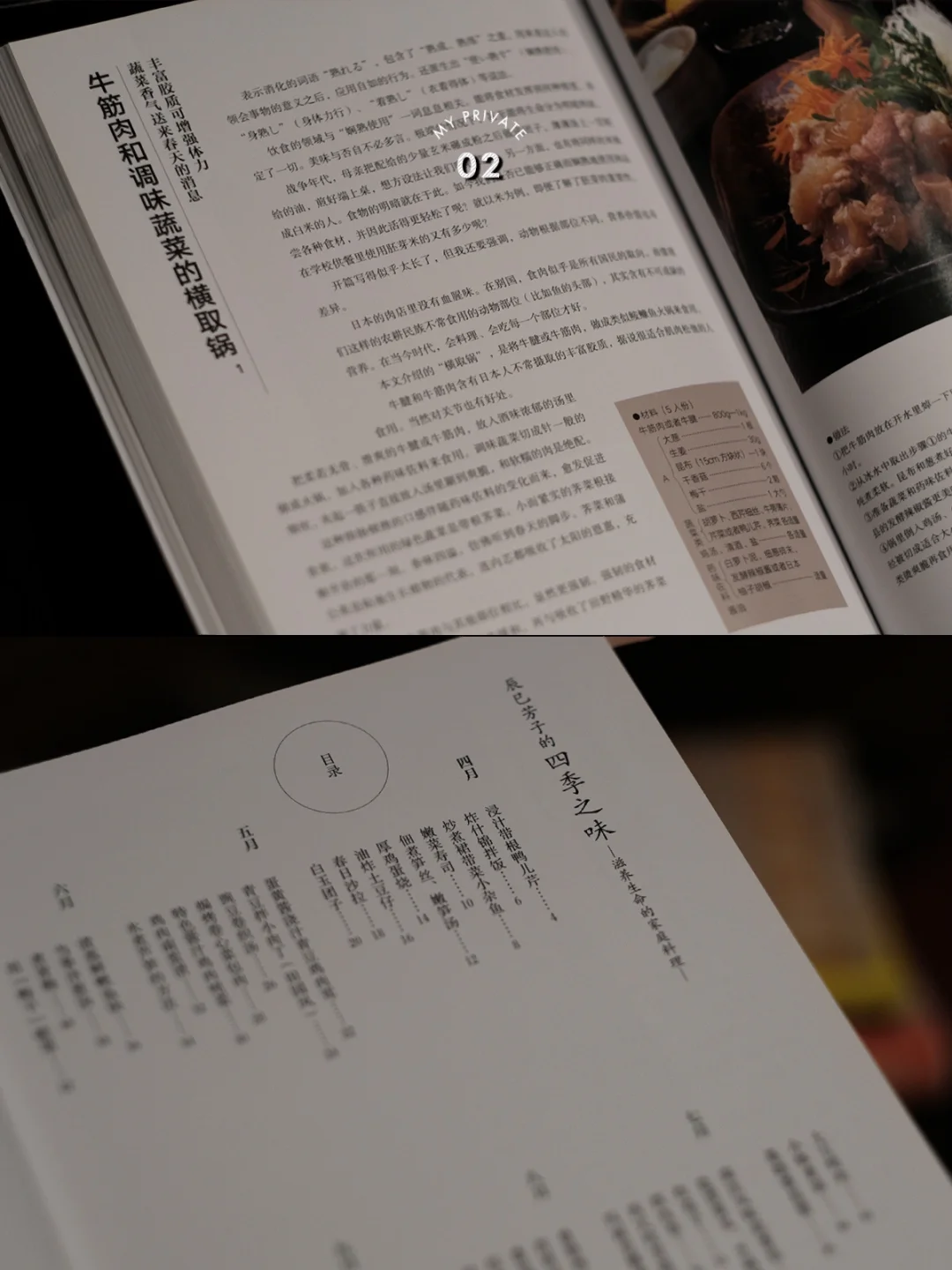 上一本偏家庭料理的话,这一本更偏向日本怀石料理,难度系数会比较大一些,它是按照鱼类海鲜、蔬菜、豆制品、肉类等类别,将每一种食材先单独详细介绍一遍,然后再是关于这个食材的几种料理,书中菜品图的摆盘以及器皿用的都很值得借鉴。