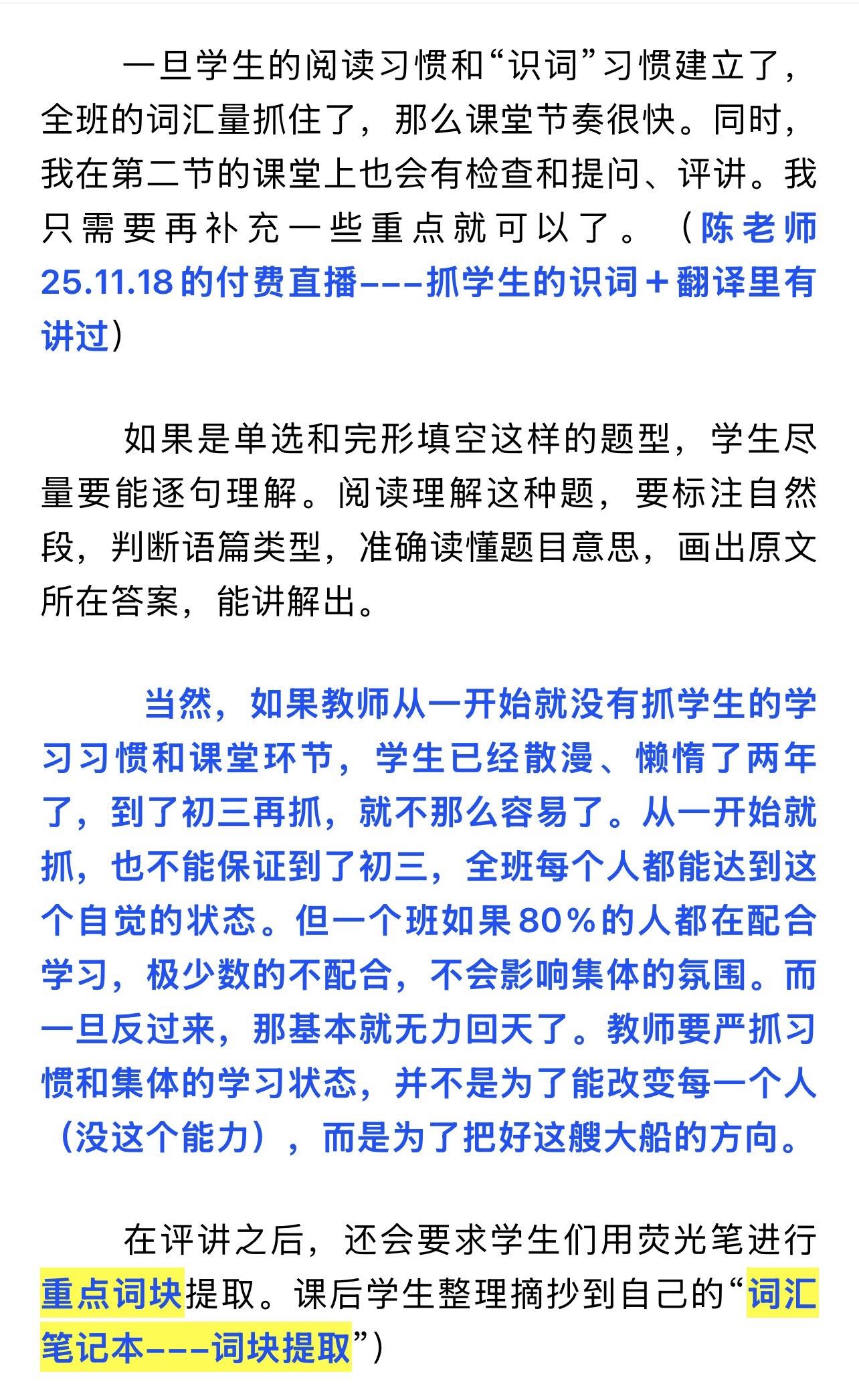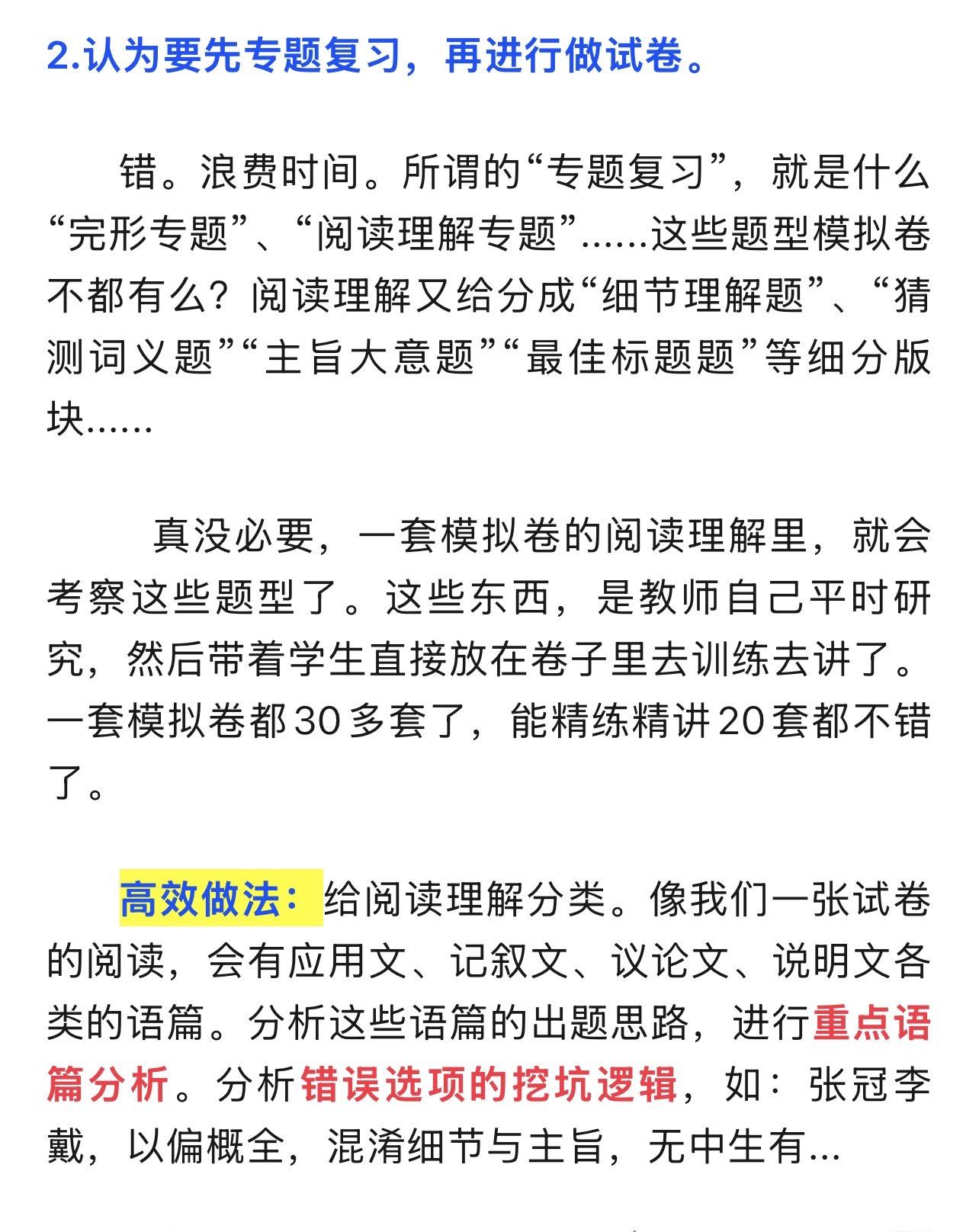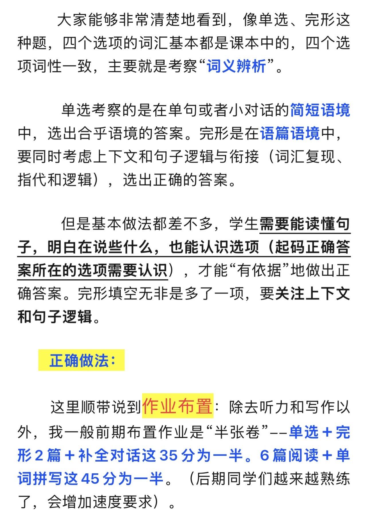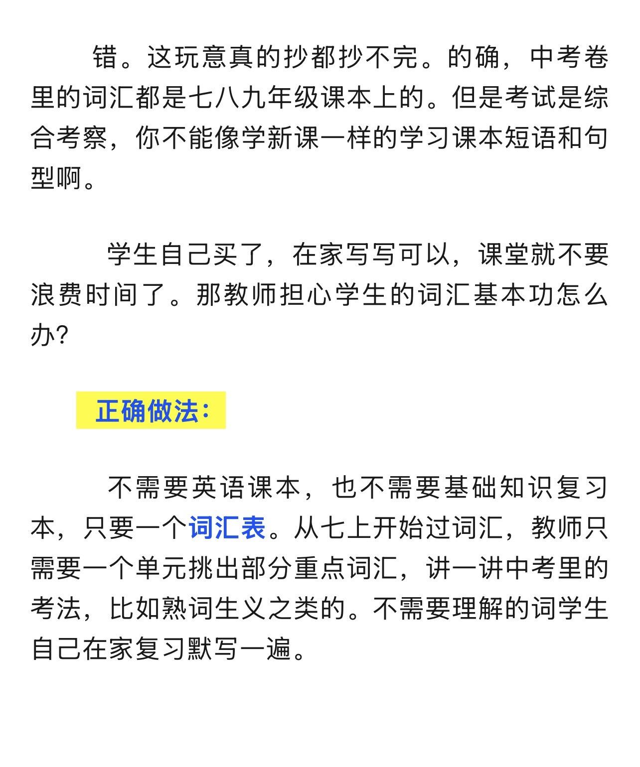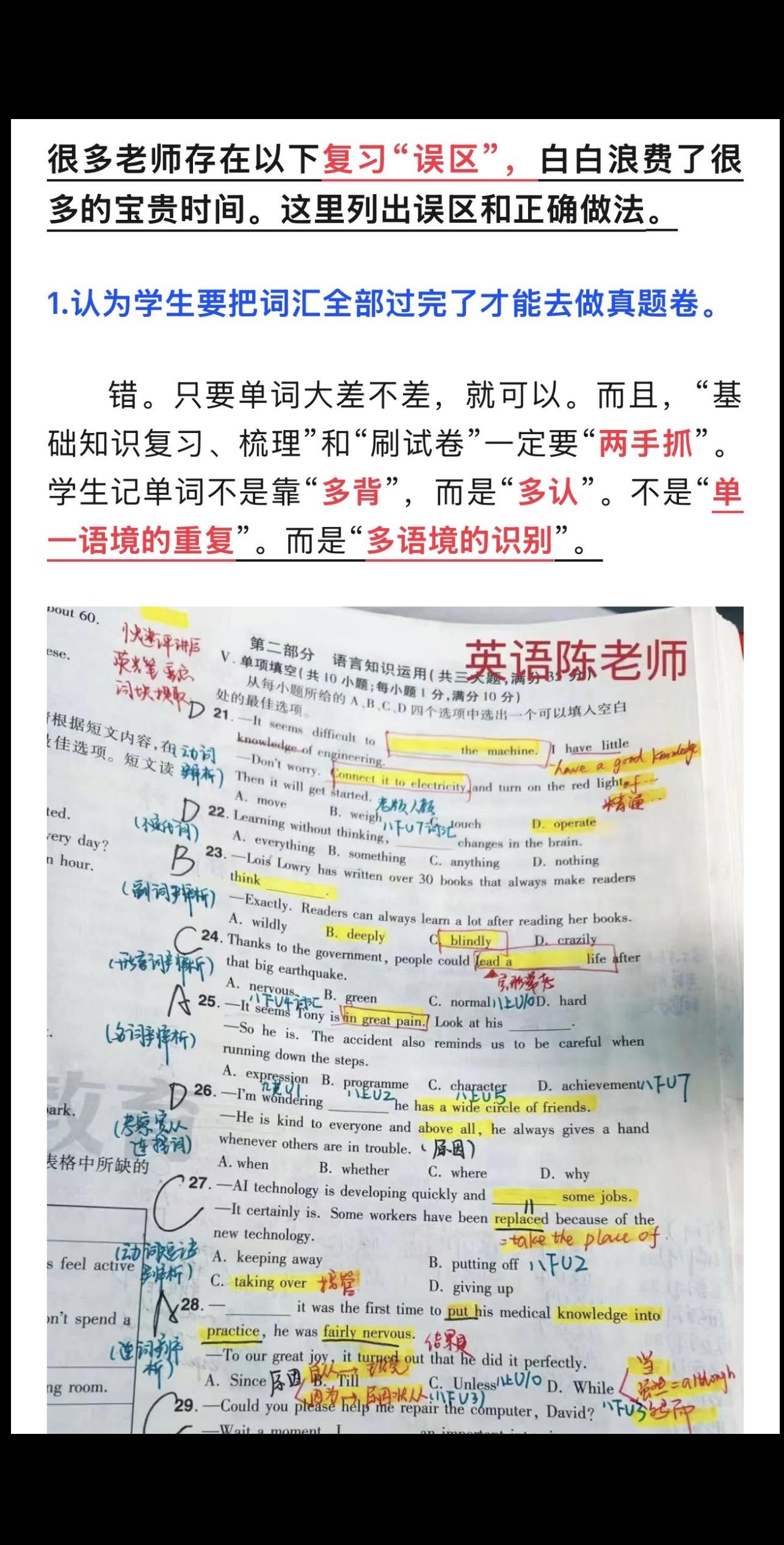 陈老师中考复习专题(1)——模拟卷的使用。26.1.6 陈老师超干货分享——中考复习专题(1) 模拟卷的使用。 模拟卷,一半用来做作业(弄懂题目,本身就是词汇复习的语境),一半用来限时测。 1️⃣如何布置作业? 2️⃣教师的常见中考复习误区——白白浪费时间。 3️⃣如何限时测。 4️⃣试卷题型分类。 5️⃣如何评讲试卷? 6️⃣如何提取词块? 本篇全篇都为免费公益分享。全文较长。完整版见公众号 陈小姐的英语课