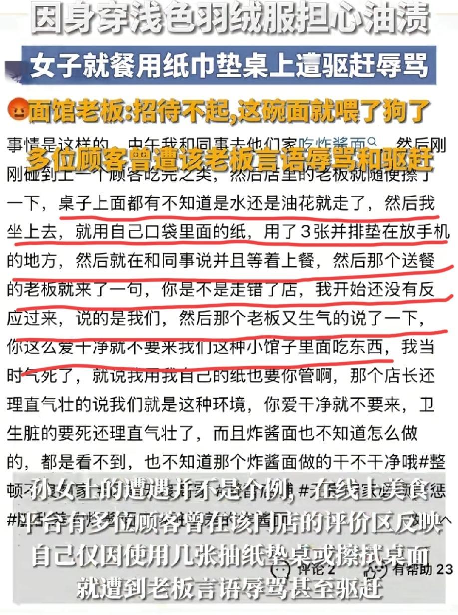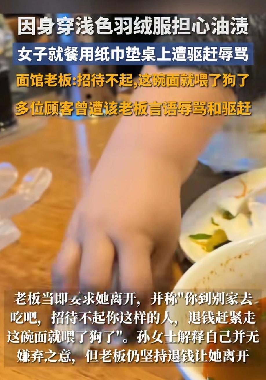 女子吃面时垫了2张餐巾纸,就遭到老板驱赶辱骂,原来老板辱骂顾客已经不是第一次了! 1月6日,苏女士在江西南昌的兄弟面馆吃面时,担心自己穿的浅色羽绒服被溅到油渍,就抽了两张抽纸,老板见状后表示:“要知道你是这种顾客就不让你进来了,退钱,招待不起”,尽管苏女士一再解释说自己没有嫌弃之意,可老板根本不听,执意要将苏女士赶出店门。 苏女士的事曝光后,有网友纷纷站出来表示,自己曾就在这家面馆遭老板辱骂过,原因几乎和苏女士的相同,也是因为前桌客人刚走,顾客用自己兜里的两张纸擦拭桌上遗留的油渍,被老板痛斥了一番。 做生意讲究的是和气生财,就算面再好吃,卫生至关重要,老板这种服务态度,顾客迟早被他赶跑了。 你们说是这个理吗?