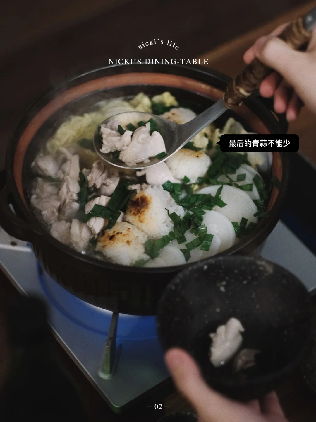 •将娃娃菜根的部分先放入锅中,依次放上白萝卜片、娃娃菜叶、鸡肉、小饭团,盖上锅盖煮至沸腾,加入一把青蒜盖上锅盖继续煮5分钟左右即可。