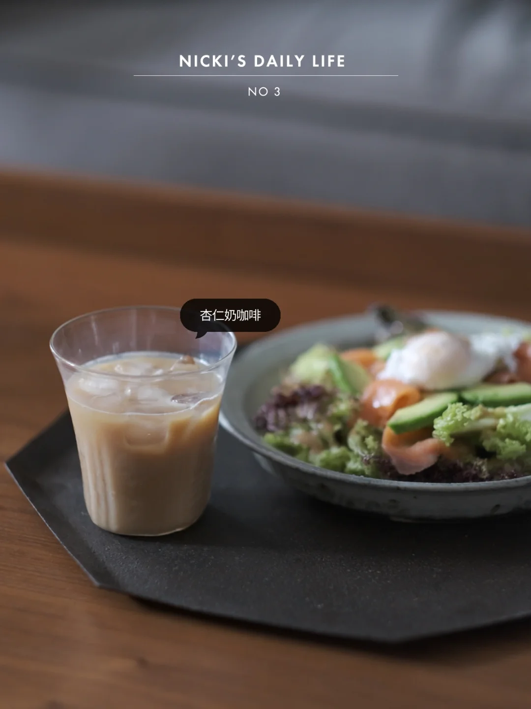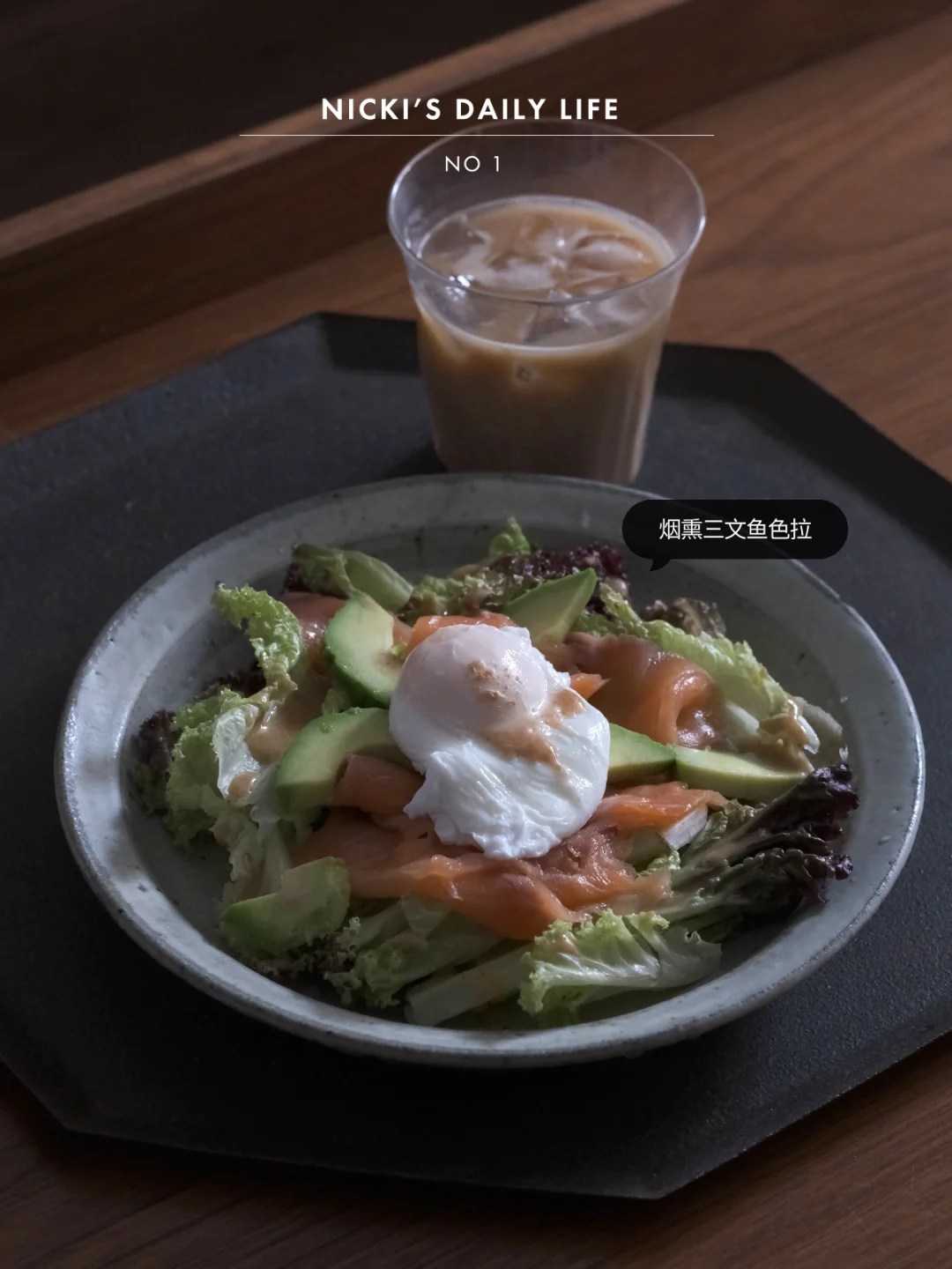 🍞早餐:烟熏三文鱼色拉+杏仁奶拿铁