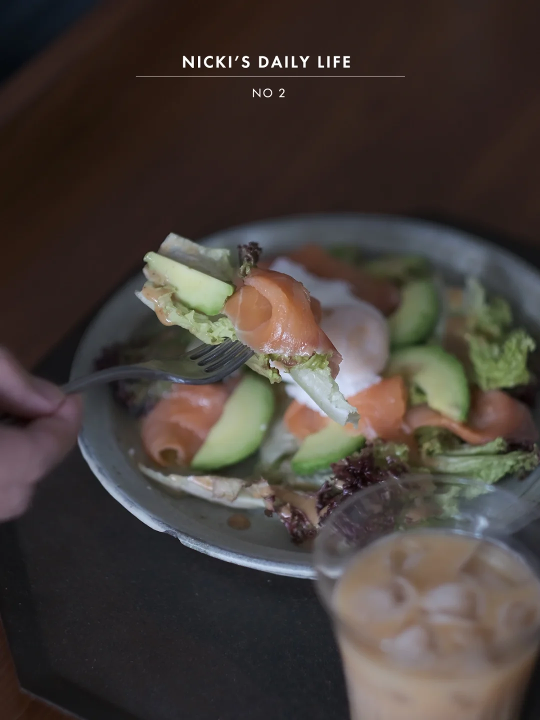 早餐主食吃完都忘记及时补上,翻了翻冰箱里还有前两天吃烤肉剩下的红珊瑚生菜,洗洗干净,放上烟熏三文鱼、一颗水波蛋,淋上胡麻酱,配上一杯杏仁奶拿铁,简单也不失营养。