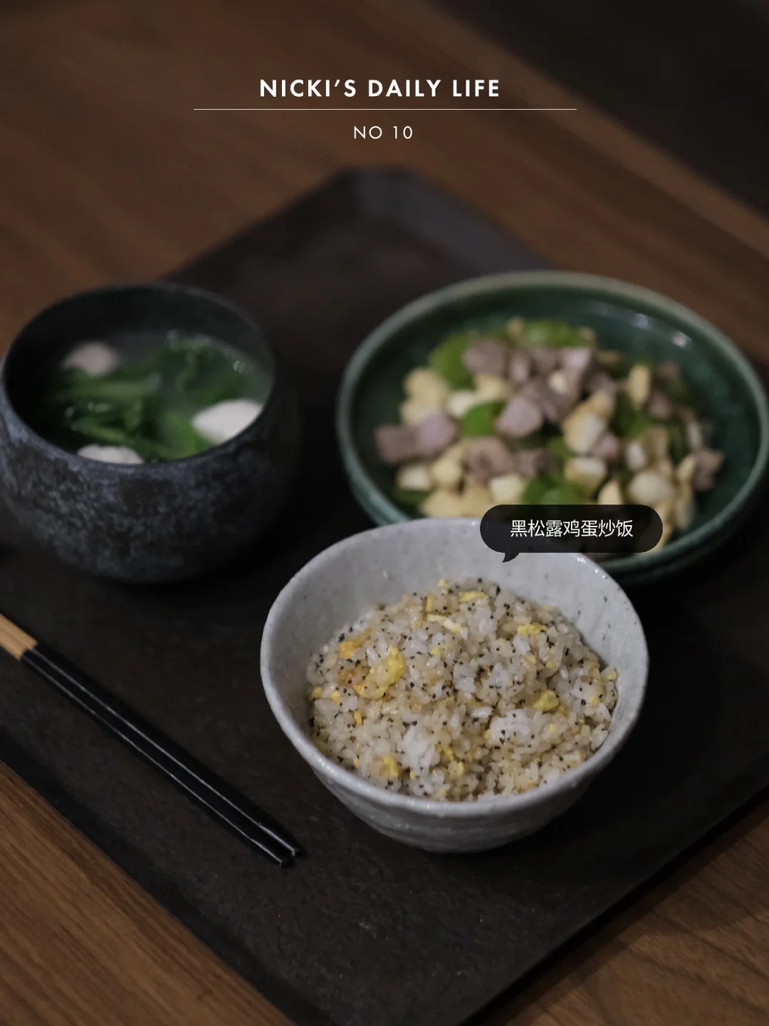 🍚晚餐:鸡蛋黑松露炒饭+茭白炒肉丁+鸡毛菜鱼丸汤