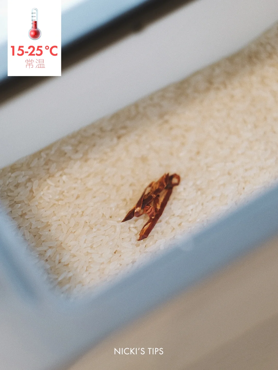 方法:大米倒入米箱或者透气的袋子里(不要放在密封袋中,湿气容易闷在里面)➡️放1根干辣椒(防止长虫)