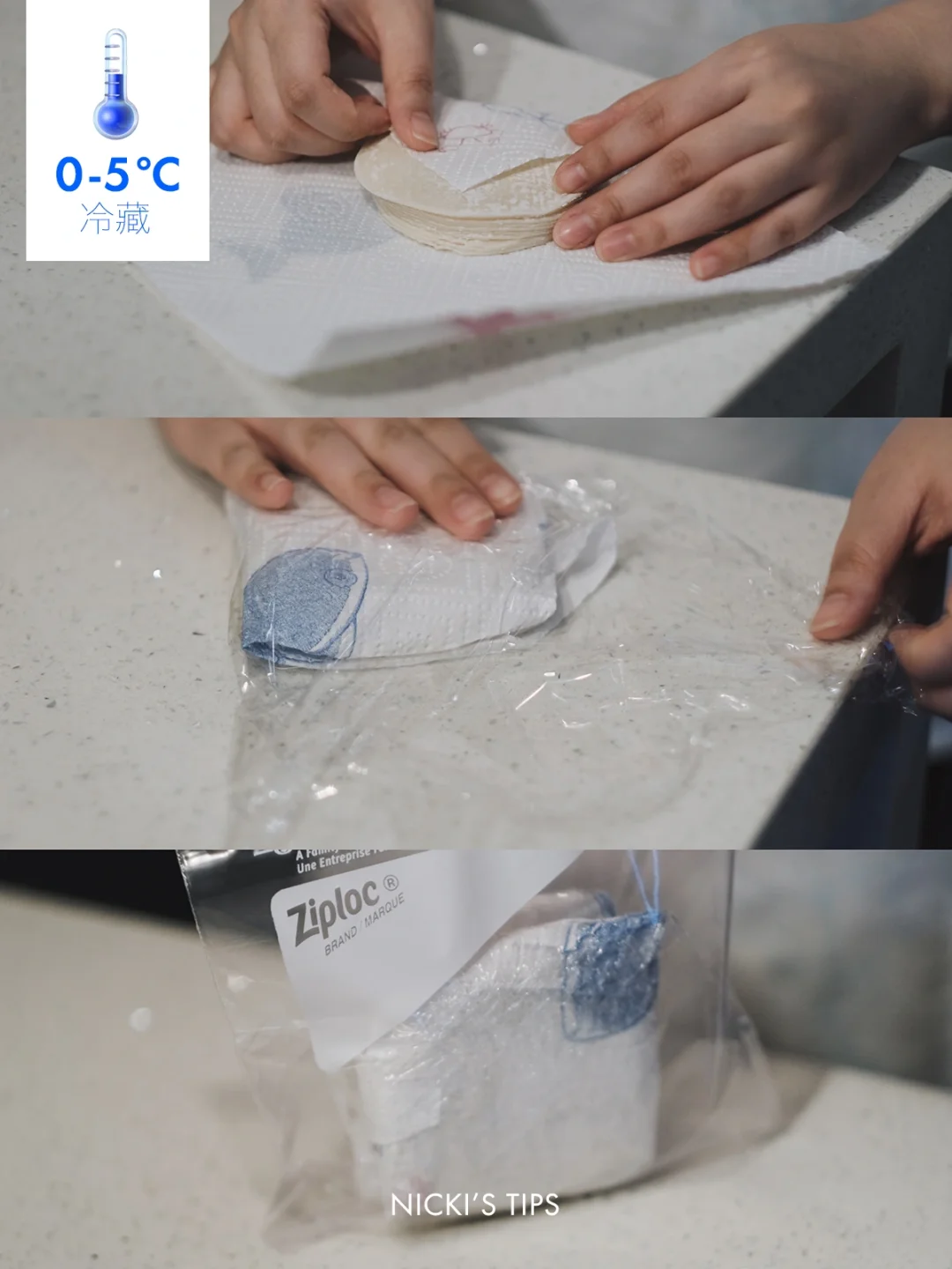 方法:用厨房用纸包好➡️再用保鲜膜包紧(防止面条、面皮干燥)➡️放进冷藏室