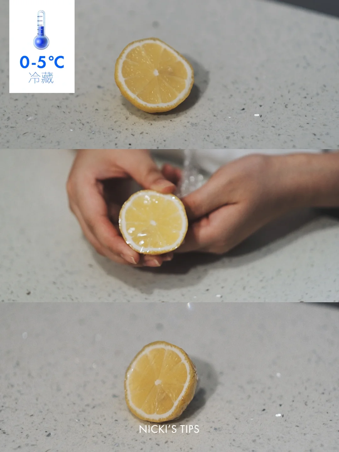 方法:切开过的水果(柠檬、西柚等)用保鲜膜包紧➡️放在冷藏室