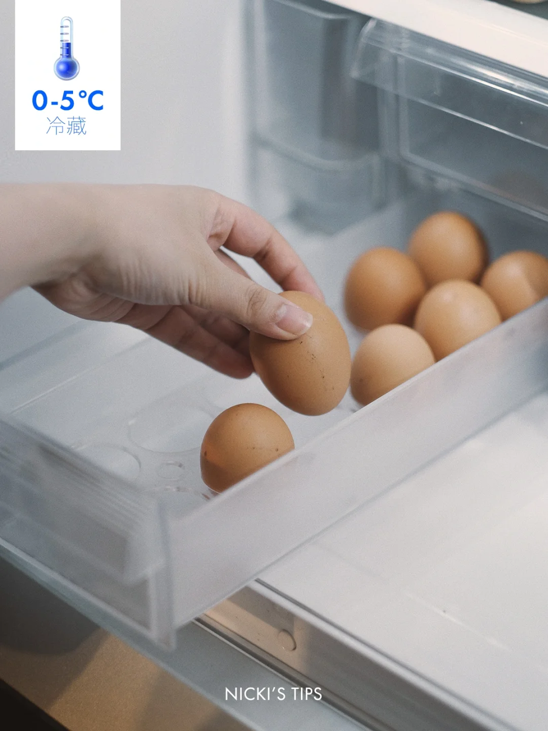 ❕鸡蛋不要放在靠近冰箱门的蛋架上,冰箱门开关时,温度变化大,鸡蛋容易变质,尽量放在包装盒内,保存于冷藏室深处。