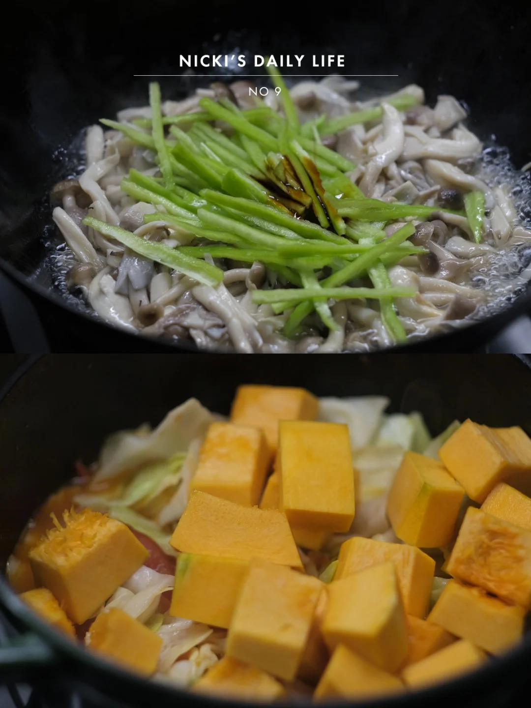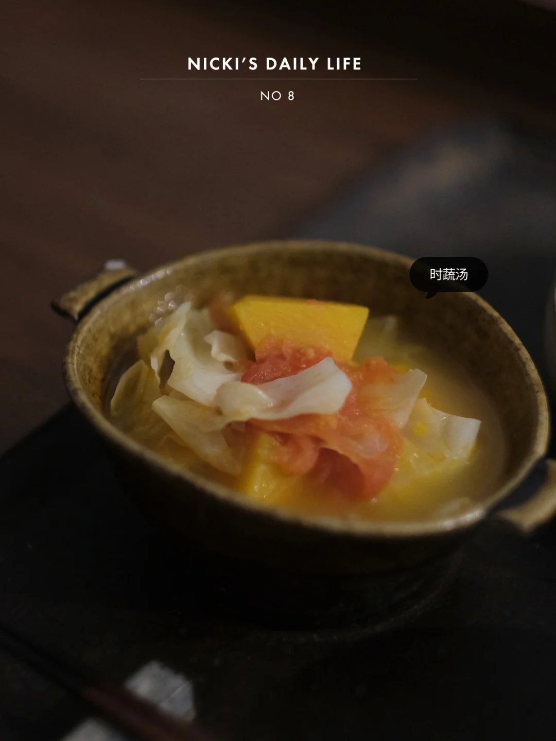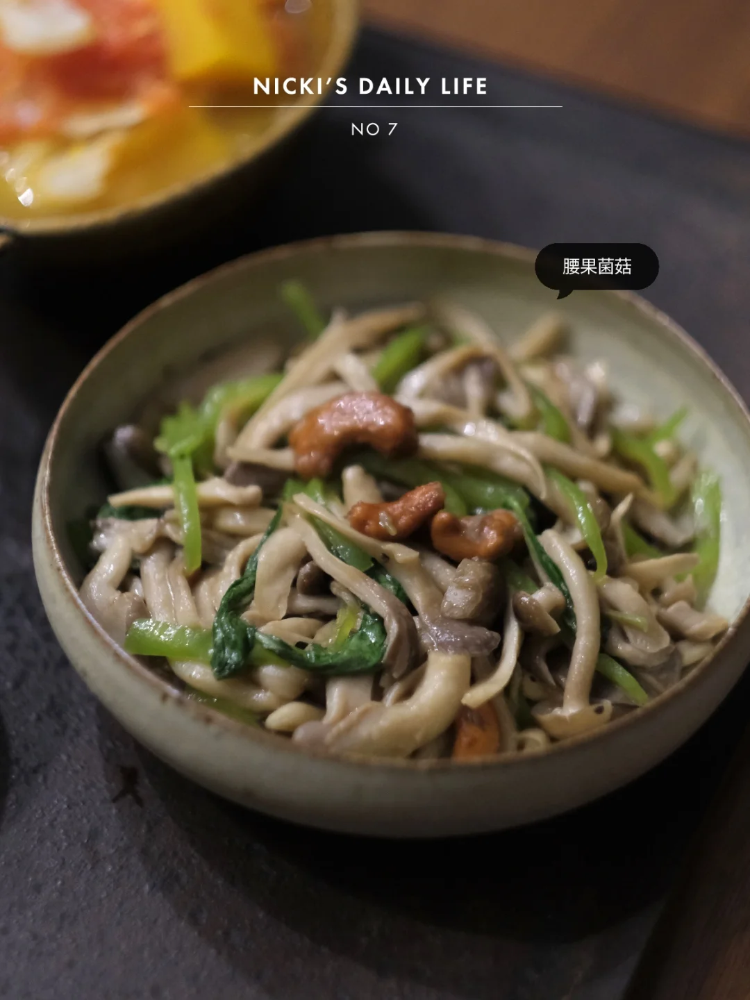 晚上用炒乌冬剩下的半颗牛心菜加上番茄、南瓜煮成汤,冰箱里的菌菇快速翻炒,加上一把腰果,口感丰富,食谱之前有写过,就不啰嗦了。