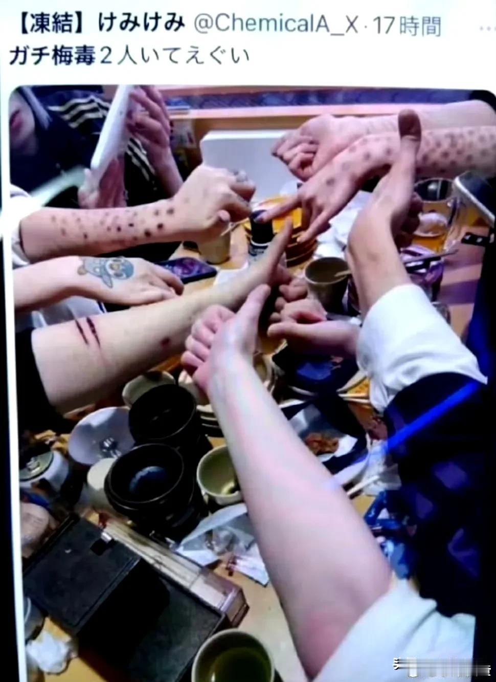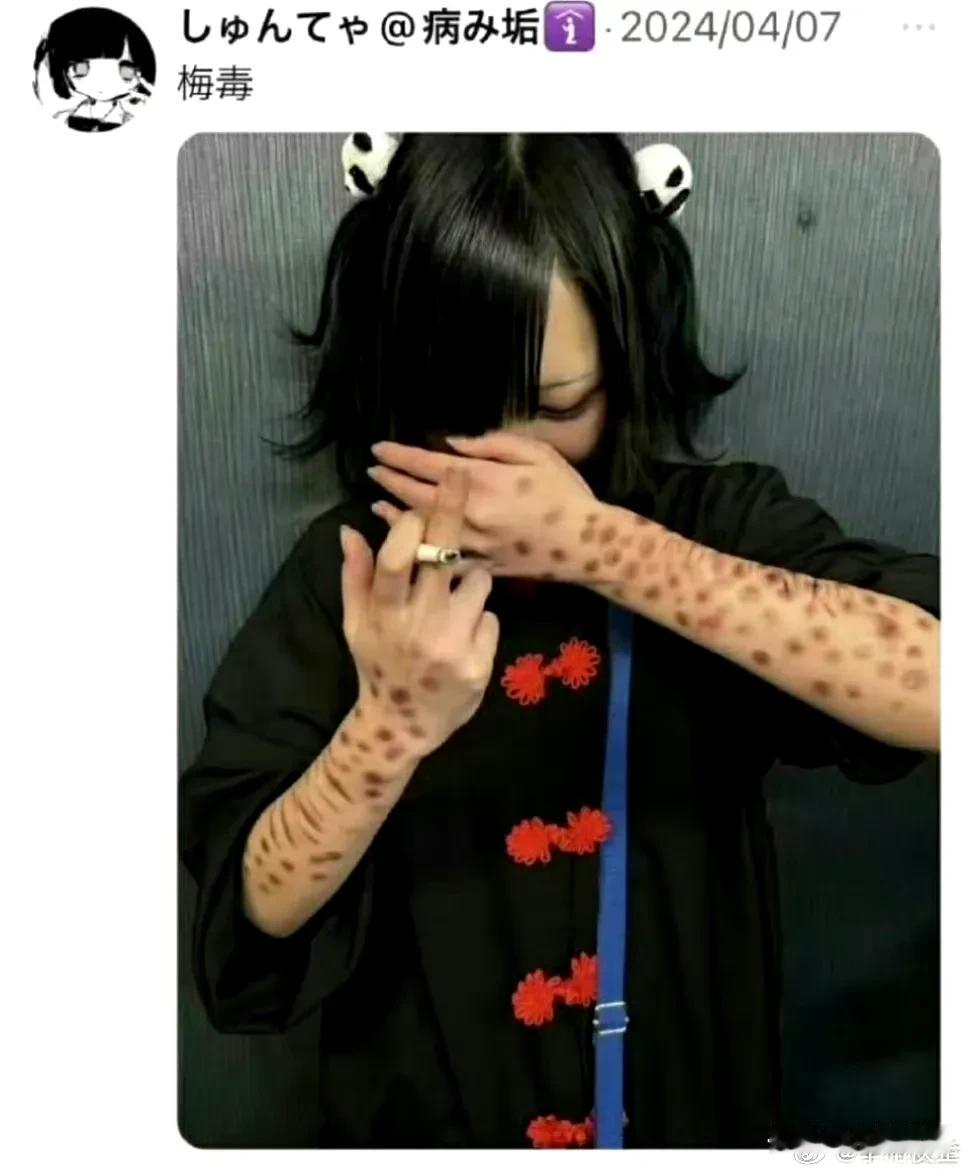 日本人现在流行晒梅毒,难怪说日本梅毒扩丧很严重,日本人不以为耻,反而以为荣,称之为日本亚文化绝活,聚众晒自己染上了梅毒,还有各种梅毒的妆容,染上梅毒的日本人以这些梅毒斑为基础,创造出各种妆容,这是到底是什么思想才会这样,才会有这种流行文化,没想它们年轻人的思想已经堕落到这种地步了!