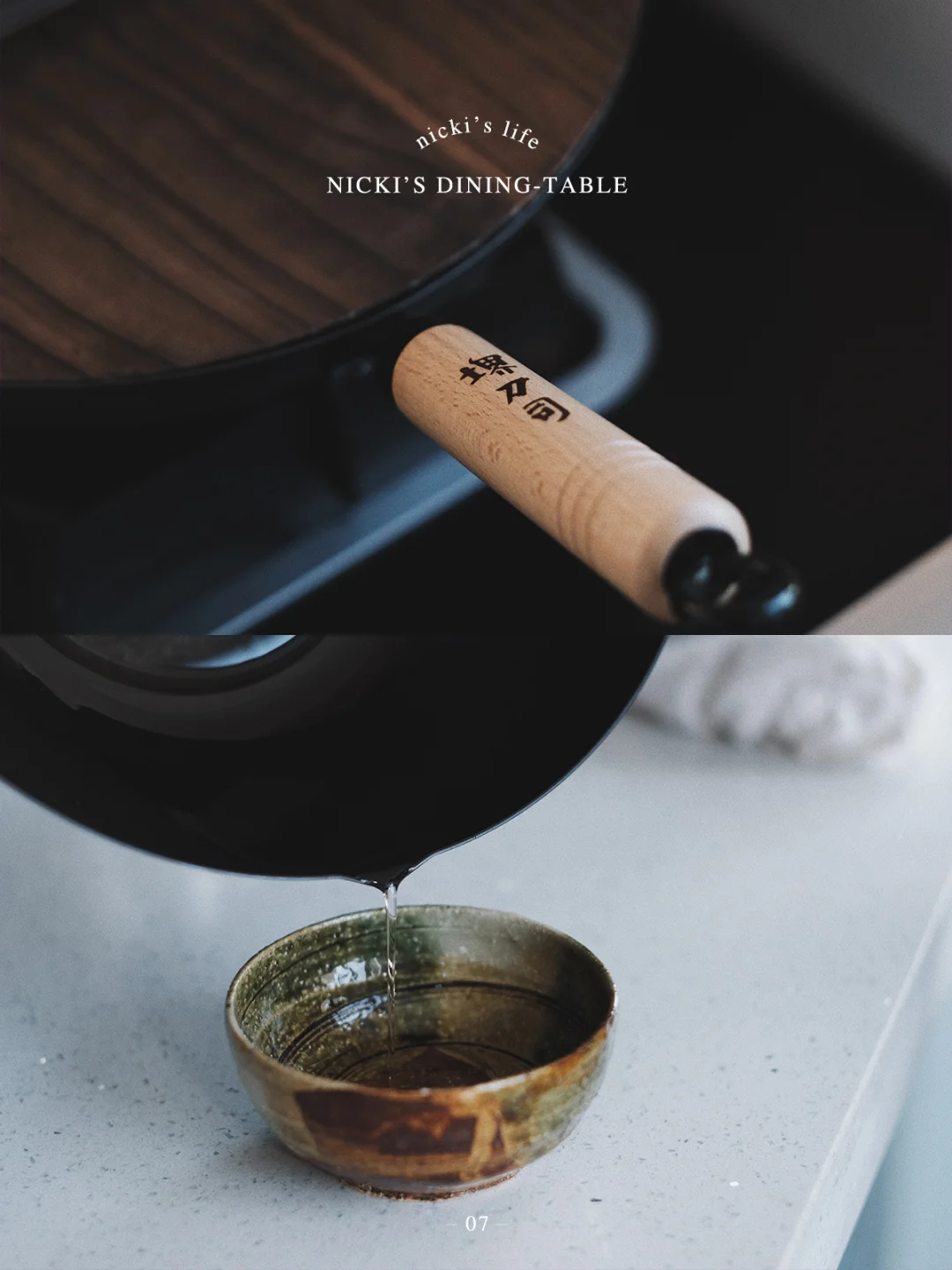 这时候又不得不夸夸这款铁锅,他两边都有导流口,能更方便的倒出锅中的油/汤汁,不会使油/酱汁在倒出的过程中流到锅底。