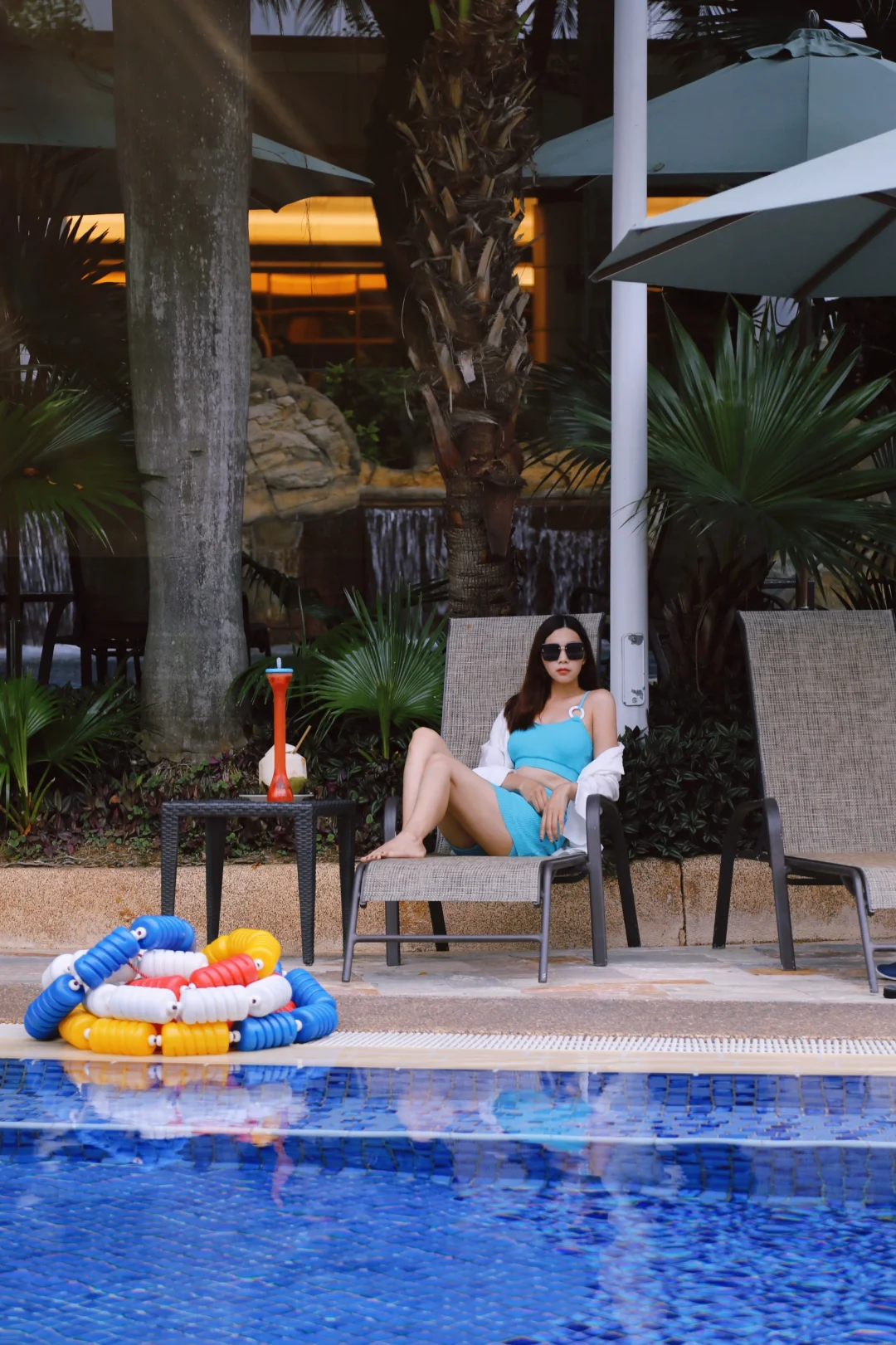 度假村里有被热带植物环绕的大型恒温室外游泳池,还有人工瀑布、水上滑梯和儿童泳池。