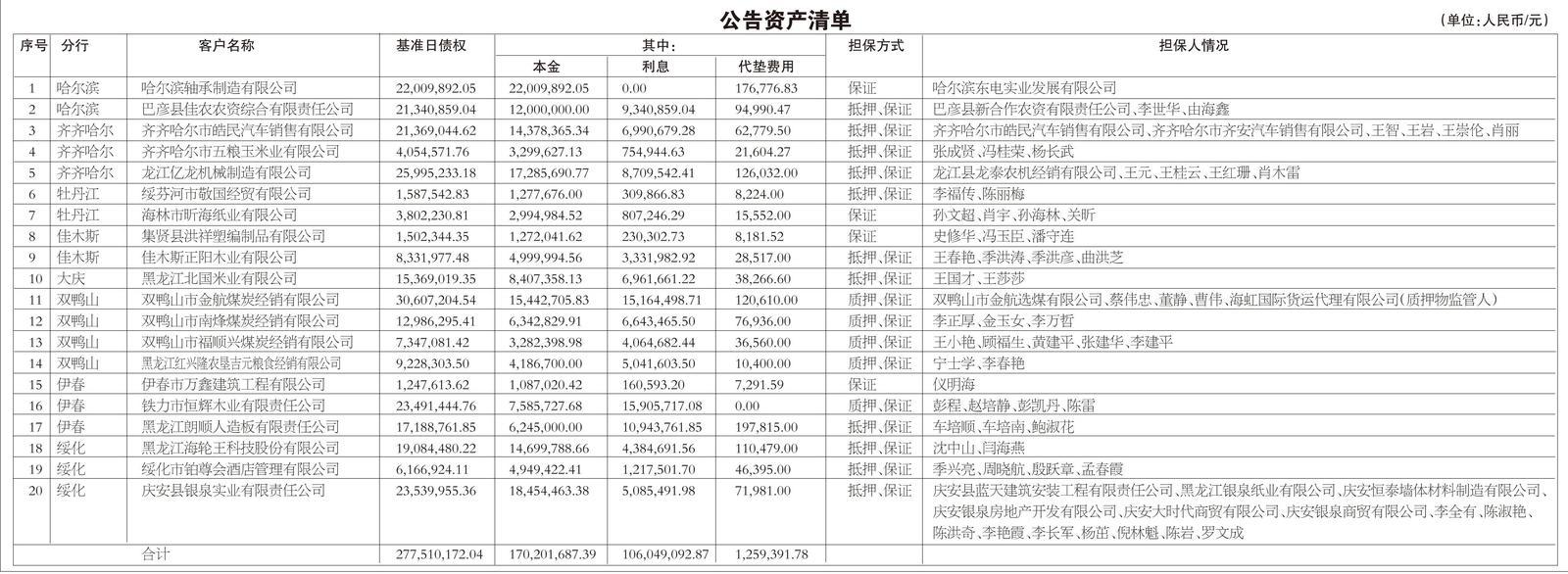 根据中国工商银行股份有限公司黑龙江省分行与中国长城资产管理股份有限公司黑龙江省分公司签署的《资产转让协议》,中国工商银行股份有限公司黑龙江省分行(含相关下属支行)已将其对下列公告资产清单列明的债务人及担保人享有的主债权及担保合同项下的全部权益以及为追索债权发生的费用而形成的债权,依法转让给中国长城资产管理股份有限公司黑龙江省分公司。中国工商银行股份有限公司黑龙江省分行与中国长城资产管理股份有限公司黑龙江省分公司联合公告通知各债务人及担保人以及其他相关各方。