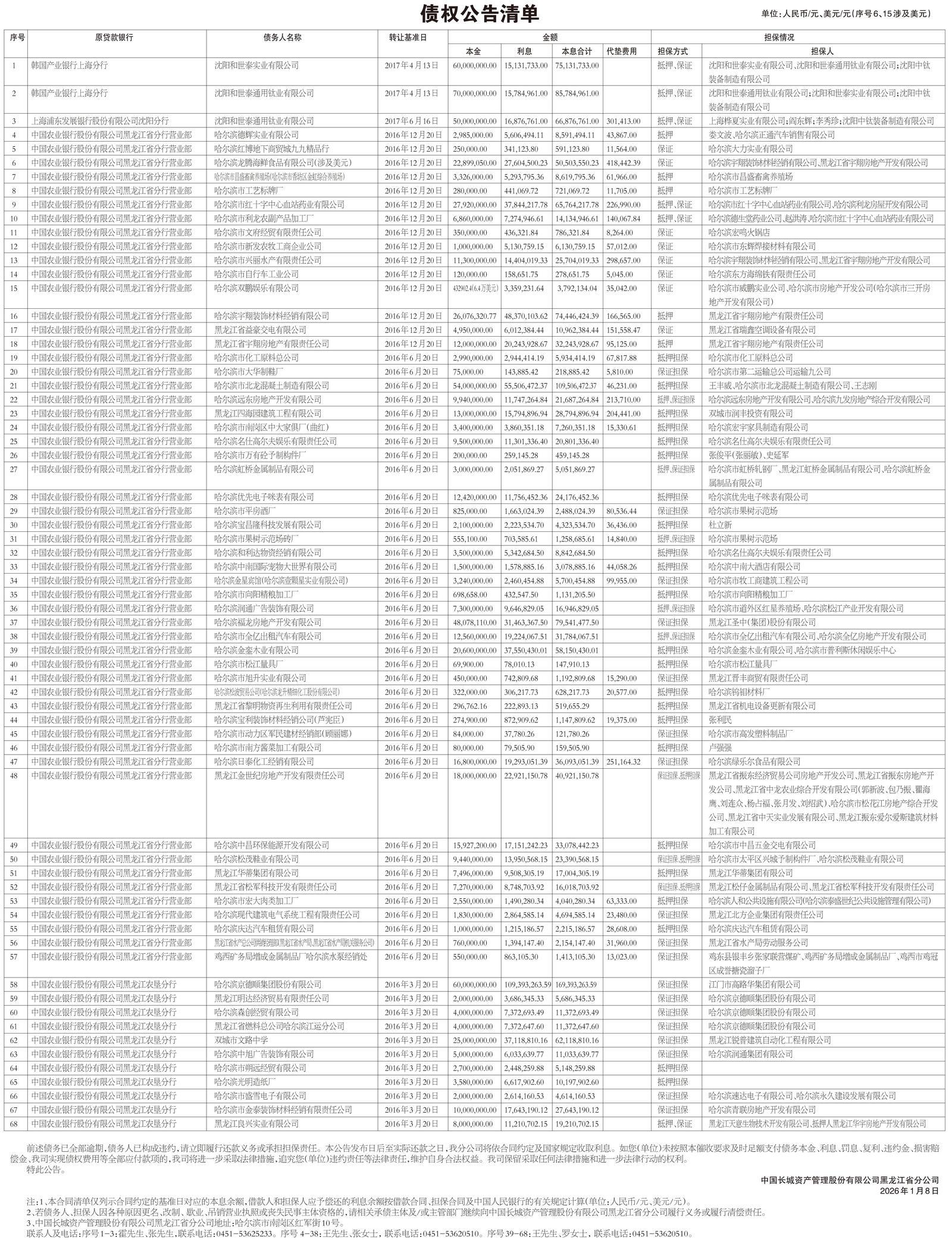 根据中国长城资产管理股份有限公司与多家银行签署的相关资产转让协议,以及借款人、担保人与原债权人签署的借款合同和担保合同,原债权人(各家银行:韩国产业银行上海分行、上海浦东发展银行股份有限公司沈阳分行、中国农业银行股份有限公司黑龙江农垦分行、中国农业银行股份有限公司黑龙江省分行营业部)对借款人、担保人享有的主债权及担保合同项下的全部权利由中国长城资产管理股份有限公司黑龙江省分公司承继并享有。请债务人及其担保人或其承继人立即向中国长城资产管理股份有限公司黑龙江省分公司履行还款义务或承担担保责任(若借款人、担保人因各种原因发生更名、改制、歇业、吊销营业执照或者丧失民事主体资格等情形,请相关承债主体、清算主体代为履行义务或者承担清算责任)。