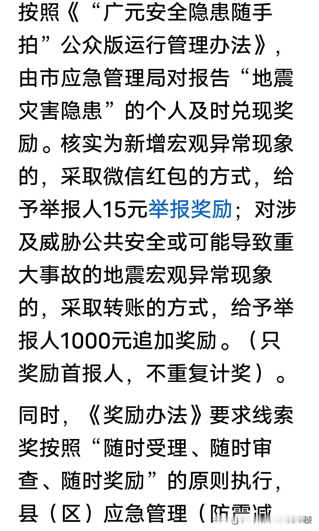广元推出全民防震减灾预防奖励机制,这一举措值得称赞!《广元市地震宏观异常现象报告奖励办法(试行)》鼓励公众参与地震宏观异常识别。若发现动物惊恐、植物反季生长、地下水水位水温改变、地面现新裂缝等异常情况,报告即可获奖励。 此前,广元举办2024年防震减灾科普作品大赛,征集到96件原创参赛作品。这些举措既发挥了群测群防体系作用,又提升了公众防震减灾意识与应急能力。有奖励激励,全民化身“防震哨兵”,让地震灾害防范更周全。 河北多数县市的水文检测能保持时刻检测。当下各地水位上涨、涌泉出现,人们担心地质灾害,实则不必,若有情况会有防震减灾救灾提醒。