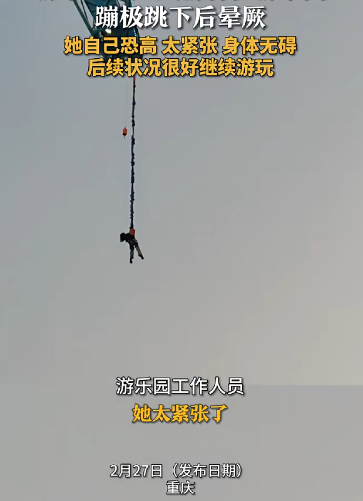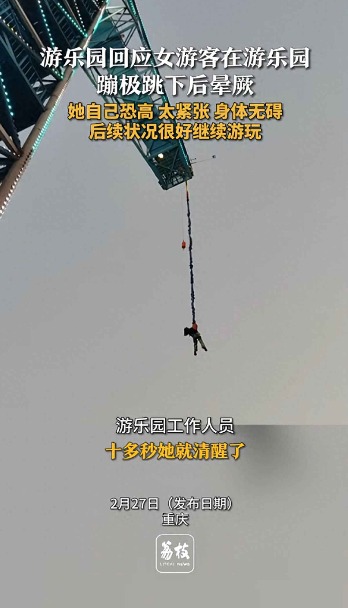 近日,重庆一女游客玩游乐园蹦极,跳下后在半空中晕厥,工作人员将其救上来。27日该游乐园工作人员回应称,她因为恐高紧张了,身体无碍,状况很好,(后来又)继续游玩了,没有去医院,蹦极目前正常开放。