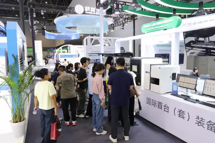 (图为2025年数贸会现场客商围绕在德适生物展品前)