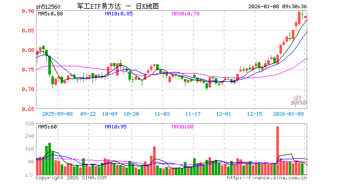 1月8日,军工ETF易方达(512560)开盘跌1.01%,报0.880元。军工ETF易方达(512560)重仓股方面,中国船舶开盘涨0.00%,中航沈飞跌0.10%,光启技术涨1.09%,航发动力跌0.05%,中航光电涨0.03%,中航西飞跌0.46%,中国长城跌0.68%,睿创微纳跌1.25%,菲利华跌1.67%,航天电子跌0.97%。