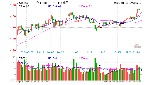 1月8日,沪深300ETF(510300)开盘跌0.27%,报4.888元。沪深300ETF(510300)重仓股方面,宁德时代开盘跌0.81%,贵州茅台跌0.00%,中国平安跌0.11%,招商银行涨0.12%,紫金矿业跌1.42%,新易盛跌1.16%,中际旭创跌1.37%,美的集团涨0.00%,东方财富跌0.98%,长江电力涨0.00%。