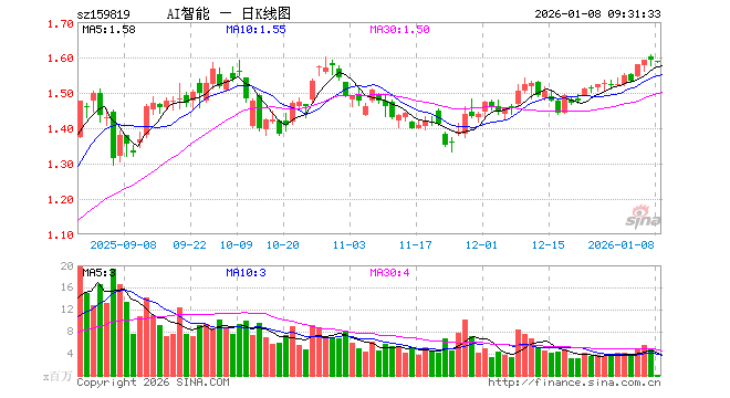 1月8日,人工智能ETF易方达(159819)开盘跌0.25%,报1.588元。人工智能ETF易方达(159819)重仓股方面,新易盛开盘跌1.16%,中际旭创跌1.37%,寒武纪涨1.01%,澜起科技跌0.88%,中科曙光涨0.40%,科大讯飞涨1.34%,豪威集团跌0.48%,海康威视跌0.20%,浪潮信息涨0.04%,金山办公跌0.46%。