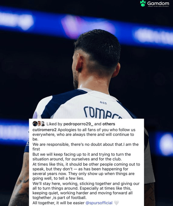 虎扑01月08日讯在热刺2-3不敌伯恩茅斯的赛后,热刺队长罗梅罗在个人社媒上向热刺球迷们道歉。