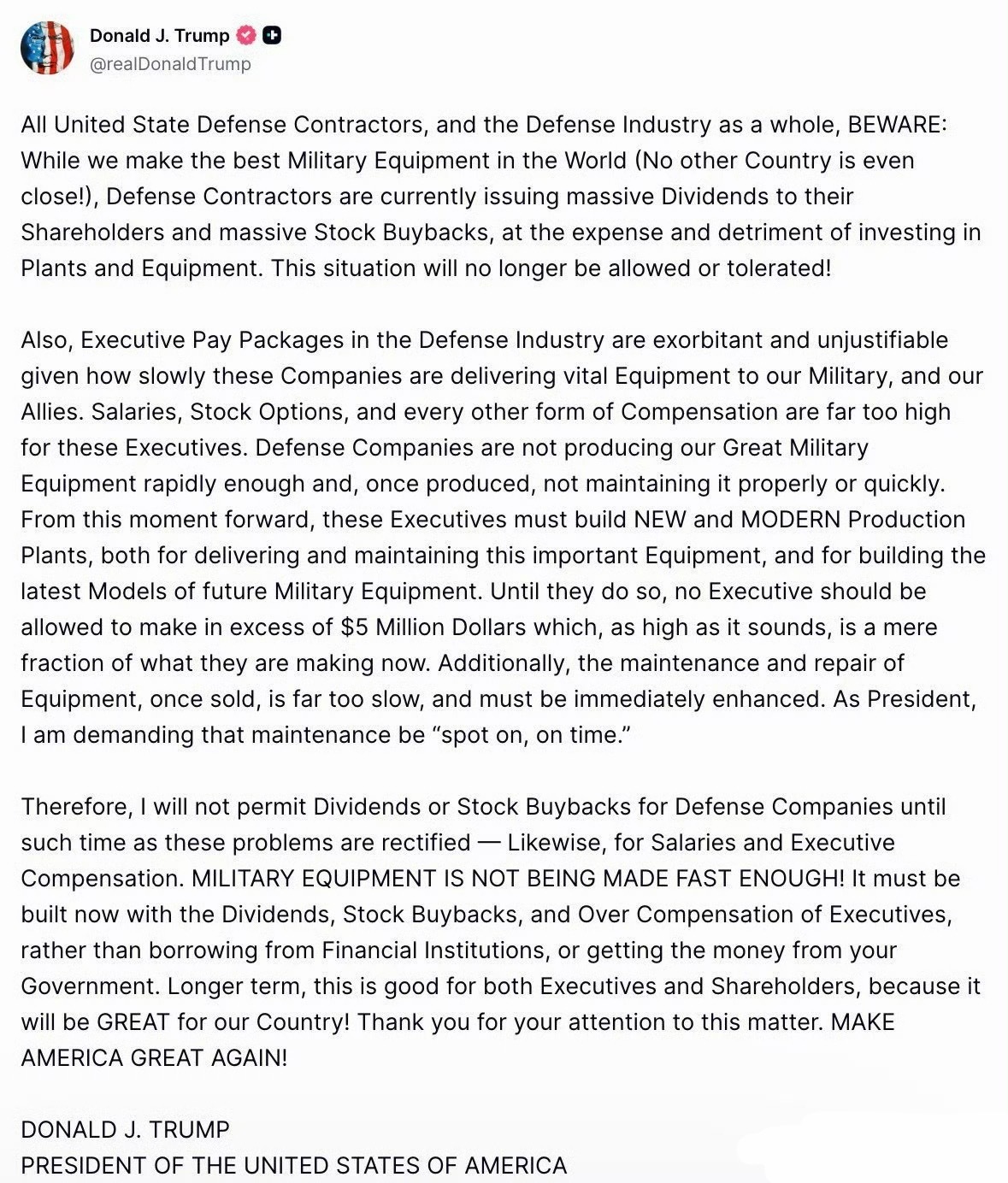 🔻特朗普表示,美国军工联合体挣得太多、造的太拉。🔻他要求:“从此刻起,这些高管必须建立全新且现代化的生产工厂,既要用于交付和维护这些重要装备,也要用于制造未来军事装备的最新型号。在他们做到这一点之前,任何高管的收入都不应超过500万美元”。🔻他还要求:“在这些问题得到解决之前,我不会允许国防公司发放股息或进行股票回购——高管薪资和薪酬也同样如此。”🔻很有精神!🔻via snapsteam新闻服务美国一口气退66个群热点现场海外新鲜事