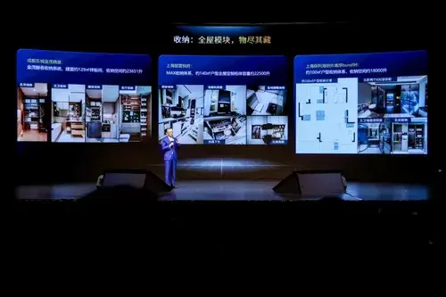 成都东城金茂晓棠129平方米样板间,收纳空间约23651升,基本上一个小家庭所有的收纳都可以全部解决了。华润上海翡雲悦府,上海的规划比较严,能够做到两万多升很不容易了。上海保利海玥外滩序,也做了18000升,比其他同样的标准户型多了很多收纳空间。