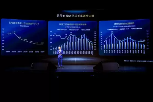 首先是百城新房供求比已连续两年只有0.81(供80平方米卖100平方米),其次是新开工已连续四年低于新房销售,现在的存量去化越来越好,第三是供地规模还在持续的控量提质。土地市场和商品房的规模已经趋于平衡,这是动态供求信号。