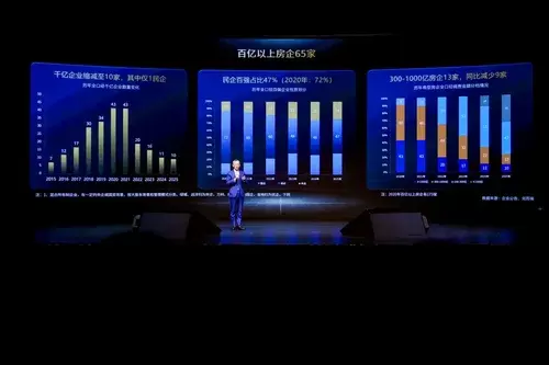 千亿企业2025年只有十家了,民企还是一家。百亿房企现在也只有65家了。在2020年最高点的时候,我们百亿企业有173家。无论房企是主动或被动控制规模,房地产已经和2021年之前是两回事,今天应该走一条房地产的新路。