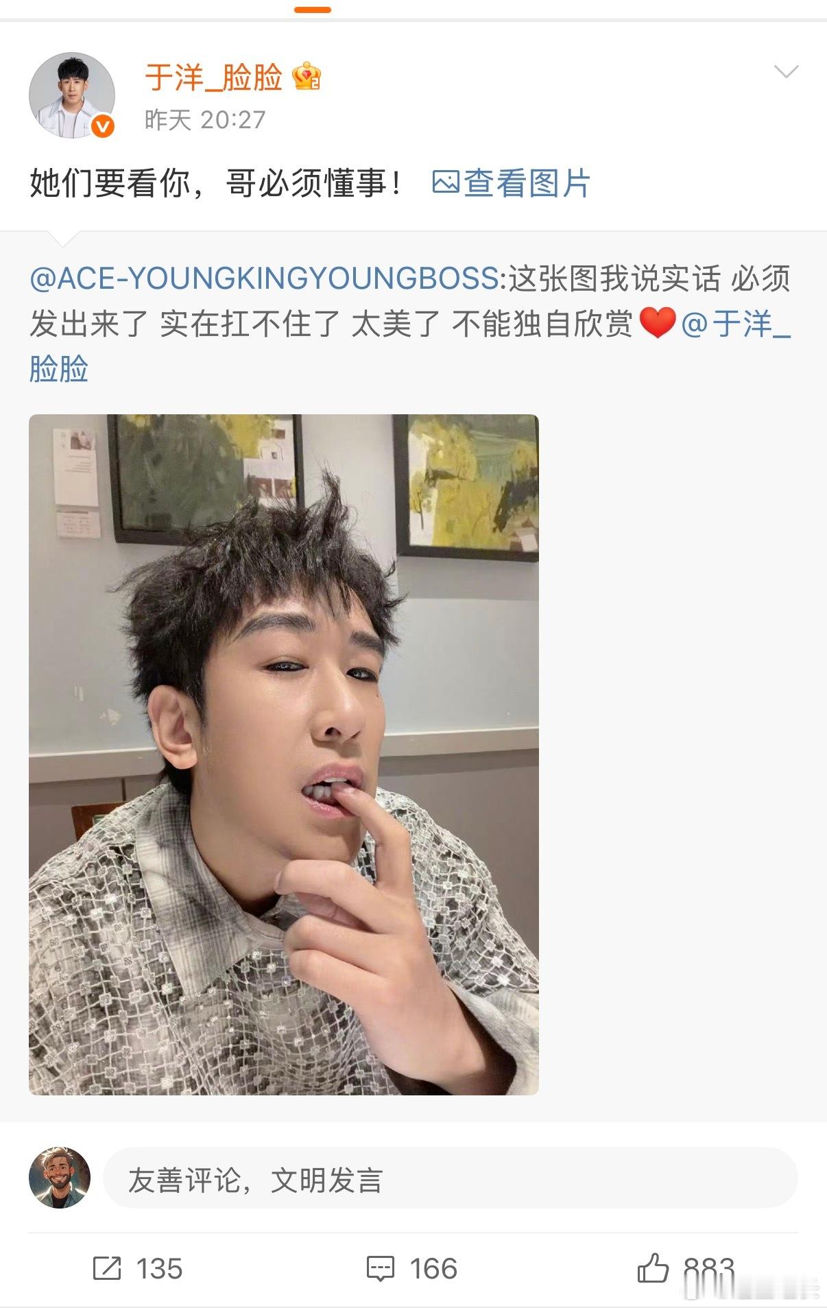 严重怀疑黄子韬是于洋的嬷嬷粉 笑晕!黄子韬对于洋的“双标式宠爱”也太嬷嬷粉了吧🤣 主动晒出对方美照疯狂夸赞“实在扛不住了 太美了”,转头就因为自己给的三张帅照只被发一张,委屈吐槽“你是不是有病”,被于洋补发自拍后直接拿捏幸福感~ 既要炫耀自家“崽”的美貌,又要执着于自己的帅照被完整输出,这操心又护短的样子,嬷嬷粉实锤了!谁不想拥有这样双向互怼又互宠的神仙友情啊