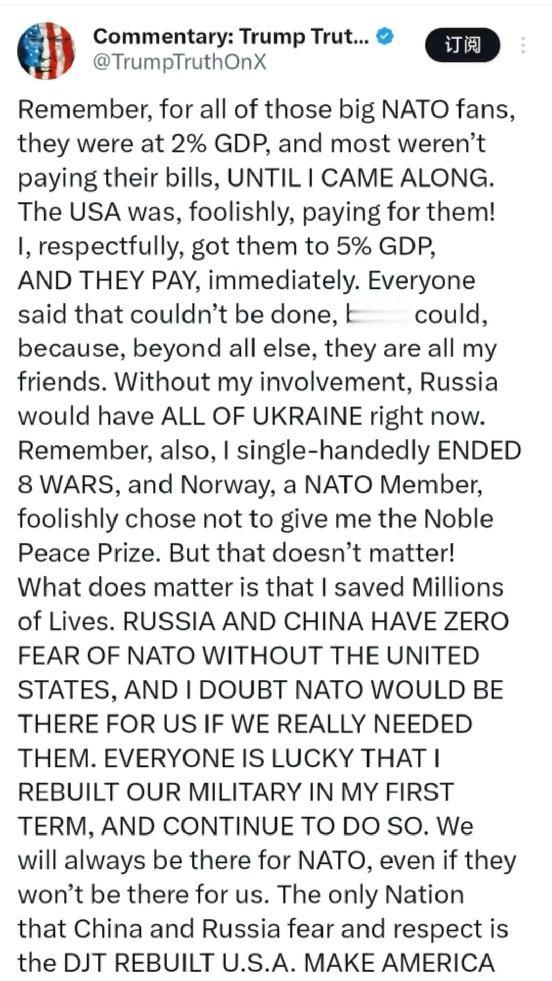 昨天,特朗普发文写道:“我上任前,北约国家军费占GDP的比例不足2%且无力支付,是我在外界认为不可能完成的情况下推动占比升至5%,盟友也足额缴费;也是我单枪匹马结束8场战争、凭一己之力阻止俄罗斯占领整个乌克兰,拯救数百万人生命,即使这样我却仍然没有获得诺贝尔和平奖,不过无所谓,大家都看到,正是我重建了美军,才让中俄心生敬畏与尊重,如今,美国对北约的支持是单方面的,这需要有所改变,我们有责任重建美国,让美国再次伟大!” [机智]特朗普这番自我封神的吹嘘,堪称霸权式自恋的巅峰闹剧,声称将北约军费占比从2%推至5%,却不知美国自身都难达这一目标,多数欧洲盟国因经济压力激烈反对,所谓足额缴费纯属自欺欺人,自诩单枪匹马结束8场战争,实则泰柬边境冲突重启、印巴否认其调停作用,俄乌冲突更是调停无果,所谓“和平功绩”不过是8场外交作秀,普京早已明言联俄制华不切实际,中俄何来畏惧尊重?一边威胁要对北约盟友丹麦的格陵兰岛动武,一边抱怨盟国可能不施援手,这般又威胁又卖惨的操作,暴露其唯利是图的霸权本质,从“通俄门”到“北约脑死亡”的警告,历史与现实早已戳穿其谎言,所谓让美国再次伟大,不过是裹挟盟友、搅动局势的霸权迷梦!