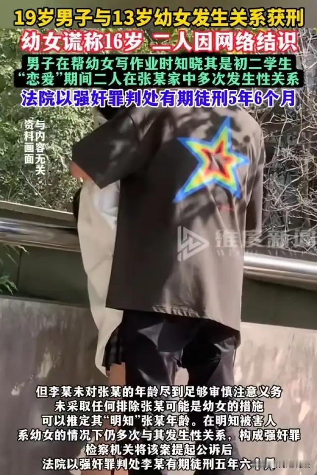 “我们是恋爱,怎么就坐牢了?”19岁男子和13岁女孩“恋爱”被判刑,揭开多少人不敢面对的真相。 “她说是16岁,我们两情相悦,还写作业、聊心事……怎么就成了强奸犯?”法庭上,李某声音颤抖。 可当法官宣判“有期徒刑五年六个月”时,整个庭审现场陷入沉默——不是因为判决太重,而是太多人终于看清了一个被长期美化的危险幻觉:未成年早恋,真的能“你情我愿”吗? 一句“她是自愿的”,骗得了自己,骗不过法律。关键细节刺痛人心:李某曾去张某家帮她写作业。 一个初二学生在做数学方程,他在旁边辅导——那一刻,他难道没意识到,**这不是情侣约会,而是一个成年人走进了未成年人的生活主场? 她谎称16岁,但校服、课本、班级群消息……处处都是破绽。 真不知道,还是不想知道?法律早就划清红线:与不满14周岁的幼女发生关系,无论是否“自愿”,均以强奸论,从重处罚。这不是不讲情面,而是用铁律挡住那些披着“爱情”外衣的越界行为。 我们总说“早恋很纯真”,却从不问:谁在承担后果? 有多少人记得自己13岁时的样子? 可能还在为考试焦虑,为父母唠叨委屈,为喜欢的明星心跳加速…… 可这个年纪的女孩,却被推向一场她根本无法理解的“亲密关系”。 她的“愿意”,是看了偶像剧后的模仿? 是对“被爱”渴望的误读? 还是以为用身体就能留住一个人? 她不懂什么叫永久的心理创伤,也不知性行为背后的社会标签有多沉重。 而那个比她大六岁的“男朋友”,却已具备完全的行为能力和法律责任。 这起案件最该警醒的,不是少年冲动,而是成年克制。19岁,已是法律意义上的完全成年人。 你有体力、有认知、有社会经验,甚至已经开始规划未来。 那么,请问:当你明知道对方是个初中生,你还靠近,是爱,还是占有? 法院判的不只是五年六个月,更是向所有类似关系发出警告:别把对未成年人的情感操控,美化成青春爱情。 真正的尊重,是“我心动,但我止步”这世界最动人的感情,不是“我们在一起了”, 而是“我喜欢你,但我知道现在不行”。 请告诉所有男孩: 保护一个未成年女孩最好的方式, 不是带她逃课、开房、说“我养你”, 而是转身离开,让她安全长大。 你怎么看?成年人和初中生“恋爱”算不算犯罪?支持严惩还是觉得可惜?评论区等你发声,也许你的观点,正在影响下一个孩子的选择。 未成年人强奸案