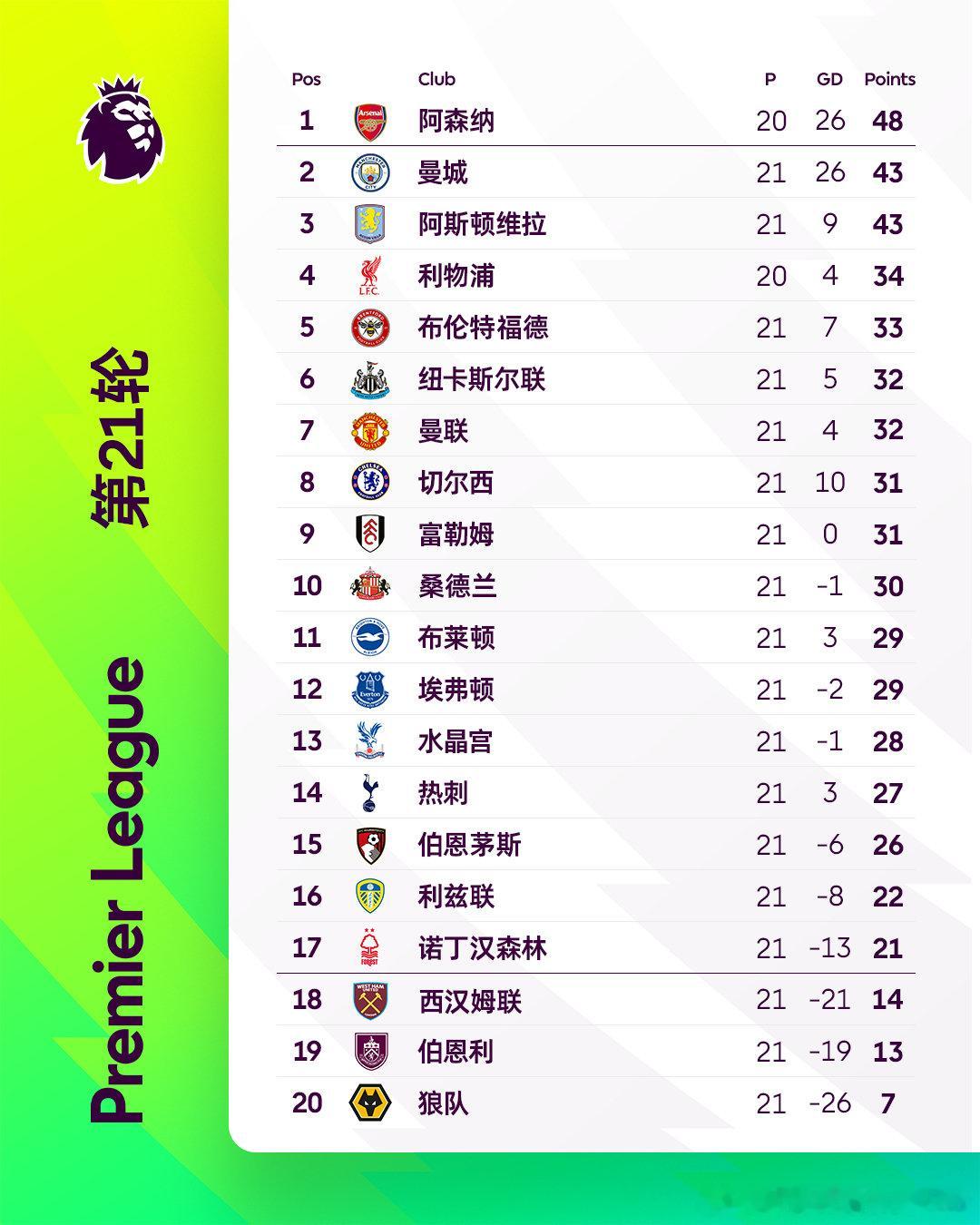 2025/26赛季英超第21轮9场战罢:◉ 曼城战平布莱顿,排名第二◉ 维拉战平